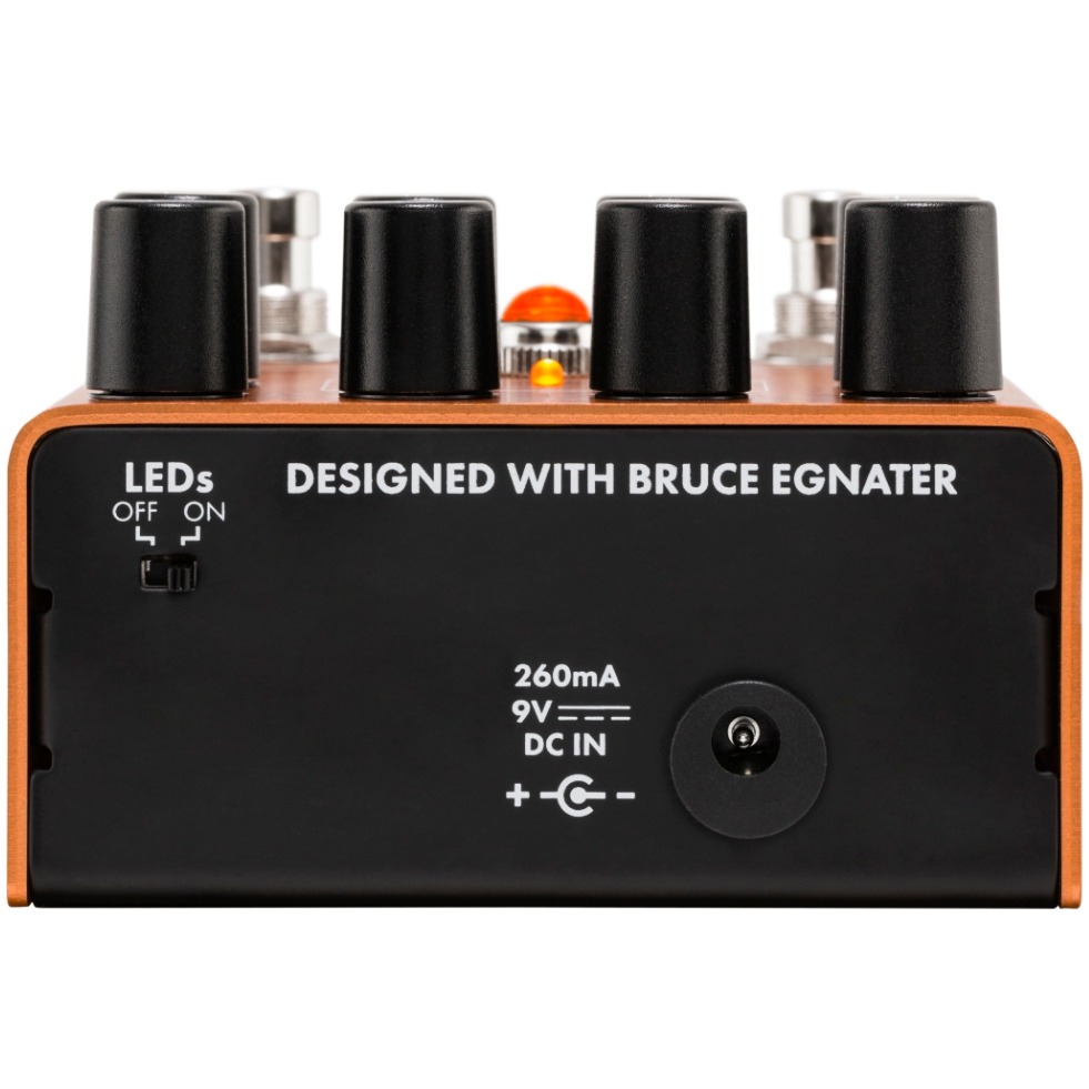 Fender MTG Tube Distortion – это уникальная педаль дисторшна, которая была разработана вместе с Брюсом Эгнатером (который работал с такими артистами, как Стив Вай, Фил Коллен, Крис Поланд, Кирк Хамметт и многими другими) и протестирована музыкантами. Встроенный трехполосный эквалайзер позволяет формировать разнообразные тональные сигналы, в то же время существует возможность отшлифовать звук с помощью регулятора плотности. Если этого недостаточно, также есть отдельное переключаемое усиление, которое имеет независимый уровень и регуляторы усиления. Многие педали пытаются имитировать ламповый звук, но вместо эмуляции ламп педаль имеет настоящие вакуумные лампочки. Сердцем конструкции MTG является лампа предусилителя 6205 производства США NOS (New Old Stock).