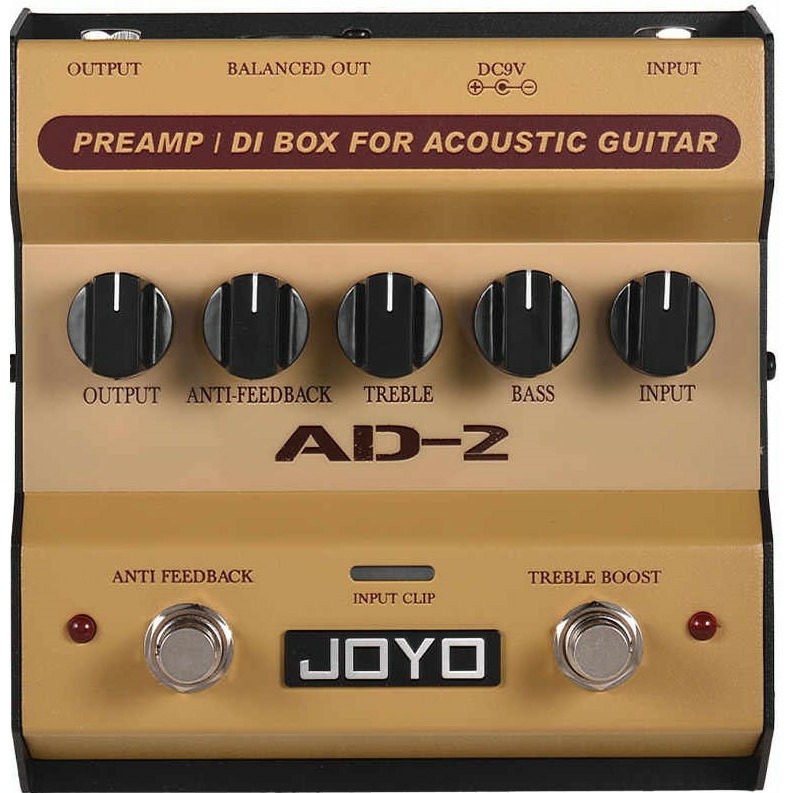 Joyo AD-2-Acc.Preamp-Di-box – предусилитель/ди-бокс в формате педали, предназначенный для акустической гитары. Встроен 2-полосный эквалайзер, который позволяет точно настроить низкие и высокие частоты. Также можно дополнительно поднять верхние частоты.