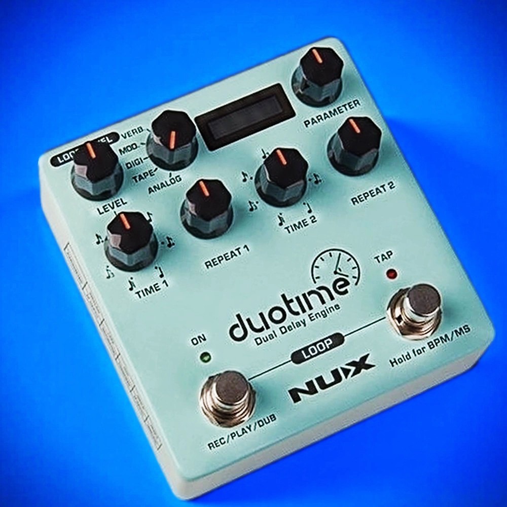 Duotime - это стерео педаль дилея с независимыми регуляторами времени/доли и повтора. В 80-х все профессиональные музыканты использовали рэковые эффекты для стереозадержки. Это была золотая эра такой легендарной инженерии, как Lexicon Delta, TC 2290, Eventide H3000 и других. Когда Nux поговорили с "работающими музыкантами", то обнаружили, что они ищут стереодилей с компактными размерами и ультрапростым управлением. Поэтому были обсуждены абсолютно необходимые требования и разработан механизм двойного дилея Duotime. Он ультра-музыкальный и простой в эксплуатации.