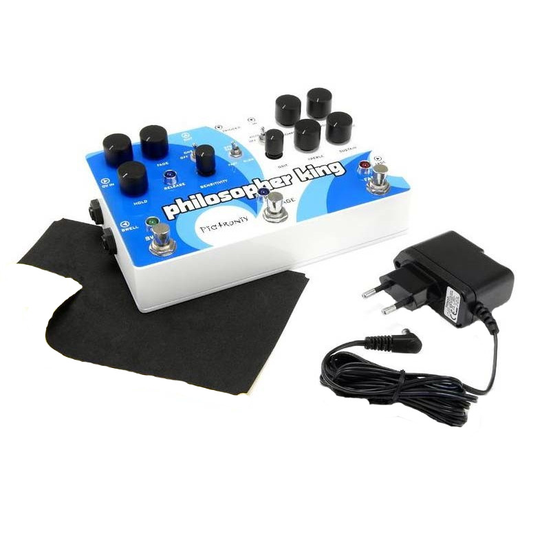 Pigtronix EGC Philosopher King Envelope Generator Compressor гитарный эффект это компрессор, педаль сустейна, дисторшн и ещё полифонический амплитудный синтезатор. В ней сочетаются схема популярной педали Philosopher’s Tone и генератор огибающей следующего поколения. Таким образом, педаль Philosopher King переносит тон на качественно другой уровень. Особенно с полным набором регуляторов ADSR (атака, затухание, сустейн, спад), включающим регулировку нарастания и ослабления звука, затухания звука, уровня задержки, диапазона скорости, режим однократного запуска, выбираемый автоматический сброс, ввод-вывод с постоянным напряжением и педаль экспрессии для контроля времени нарастания и затухания звука.
