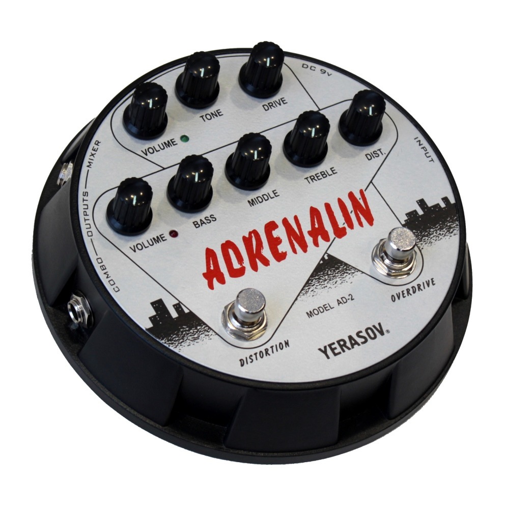 Yerasov AD-2 – многофункциональная педаль, которая соединяет в себе два эффекта: овердрайв и дисторшн. Фактически это два разных эффекта в одном устройстве, которые можно использовать как отдельно друг от друга, быстро переключаясь между ними, так и совместно. При включении педали сначала подключается овердрайв, следующим – дисторшн. Используя эффекты совместно можно получить интересную структуру звука, которую нельзя создать с применением только одного из них, а также получить великолепный продолжительный сустейн. Элементы управления расположены в верхней части педали. Для каждого из эффектов предусмотрен отдельный регулятор громкости. Для эффекта овердрайв: настройки тембра и перегруза. Для эффекта дисторшн: трёхполосный эквалайзер и регулятор уровня применяемого эффекта. Предусмотрено два выходных разъема: для подключения к усилителям и микшерам. Полноценный режим холодного обхода гарантирует, что, когда эффект не используется, он не будет оказывать влияния на гитарный звук. Педаль заключена в корпус оригинальной круглой формы. Электропитание - от сетевого адаптера AD9-100 (поставляется в комплекте) или батарейки «Крона» 9 вольт.