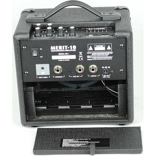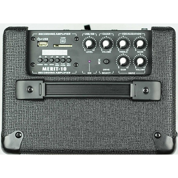 Merit-10 - портативный гитарный комбоусилитель от компании Belcat. Он имеет мощность в 10 Ватт и оснащен 6,5-дюймовым динамиком. В комбике чистый и перегруженный каналы звучания. Для чистого есть ручка громкости, а для перегруженного - ручки громкости и гейна. Двухполосный эквалайзер позволяет изменять характер звучания. Вам доступен встроенный MP3 плеер с поддержкой SD карт и функцией записи. Комбик может работать как от адаптера 12В, так и от 8 батареек С (приобретаются отдельно). Здесь есть выход 1/4" для наушников, позволяющий заниматься бесшумно.