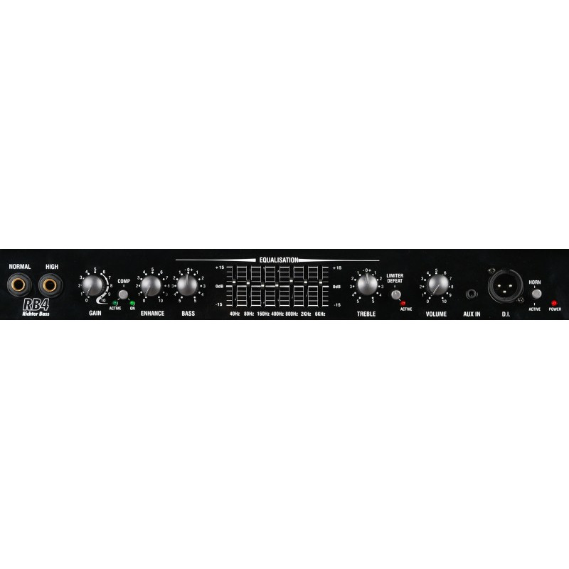 Laney RB4 комбоусилитель серьезный 165-ваттный басовый аппарат, оснащенный 15-дюймовым динамиком и отключаемым ВЧ-драйвером. Настройка тембра осуществляется с помощью 2-полосного "полочного" и 7-полосного графического эквалайзера. Изменить динамику звука позволяют отключаемый компрессор/лимитер.В целом комбоусилитель Laney RB4 - одна из самых универсальных моделей в линейке за счет эргономичного дизайна и мощности.