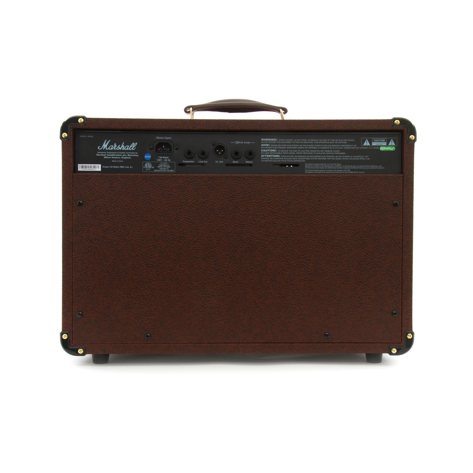 Комбоусилитель оборудован двумя динамиками. Есть секция эффектов Chorus(а) и Reverb, которые в стереорежиме значительно обогащают звучание этого усилителя. Для коммутации комбоусилитель предлагает микрофонный (XLR) и инструментальный каналы (1/4 Jack x 2), имеющие независимые органы управления, среди которых регуляторы тембра, настройка эффектов, схема подавления обратной (Anti-Feedback) и секция эффектов студийного качества (Chorus/Reverb). Для каждого из каналов доступна отдельная секция эффектов. Акустический комбо предлагает прекрасное звучание и дизайн от одного из лучших производителей гитарного оборудования, компании Marshall.