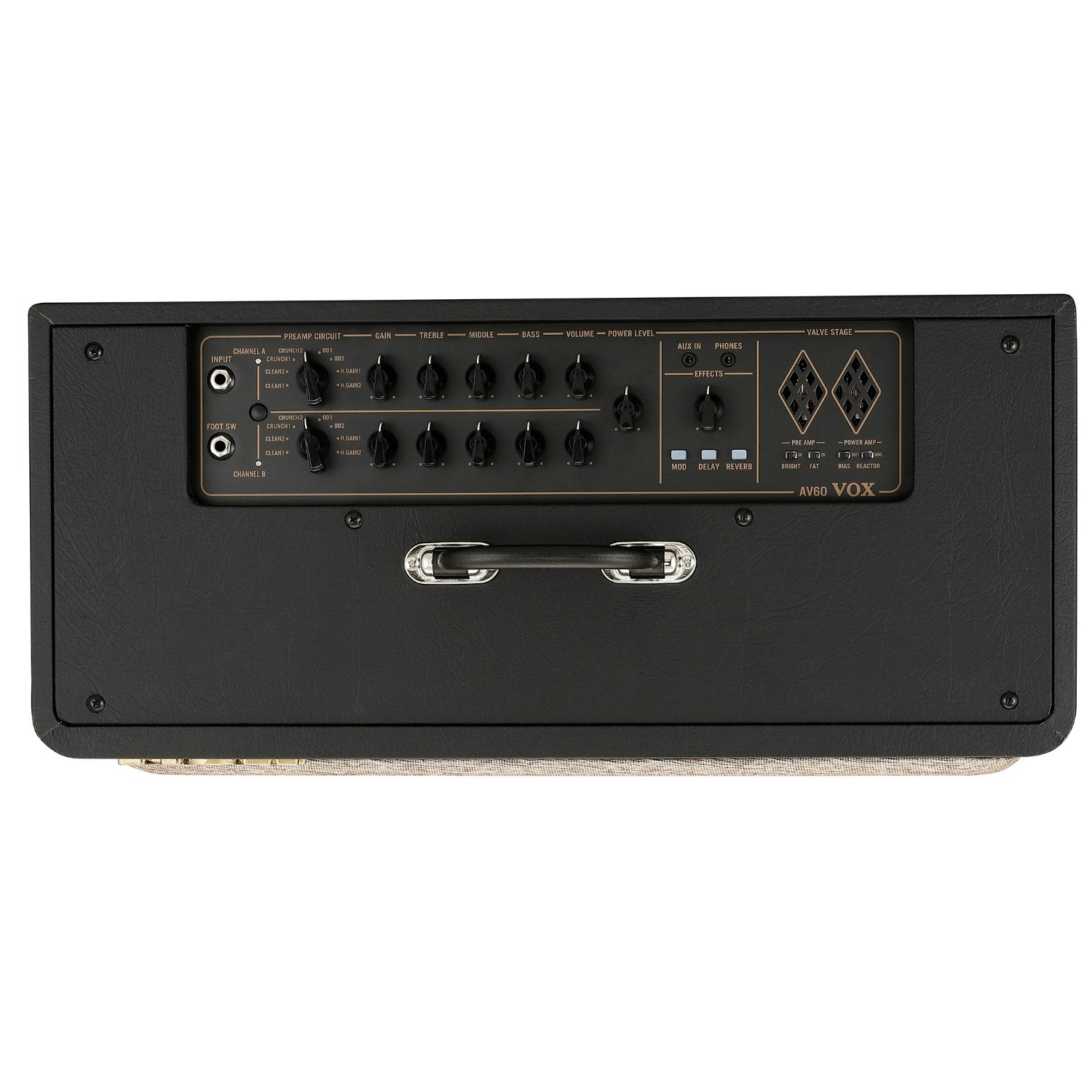 Усилитель Vox AV60 предлагает 60 Вт мощности, один динамик динамик VOX 12” и работает на двух лампах 12AX7, по одной для преампа и усилителя. Центральное место в устройстве занимают восемь аналоговых схем предусилителя с эмуляцией звучания восьми гитарных усилителей на каждом из двух каналов. Эмуляции звучания позволяют выбирать из широкого спектра различных тонов, от богатого чистого до по-настоящему хай-гейнового.