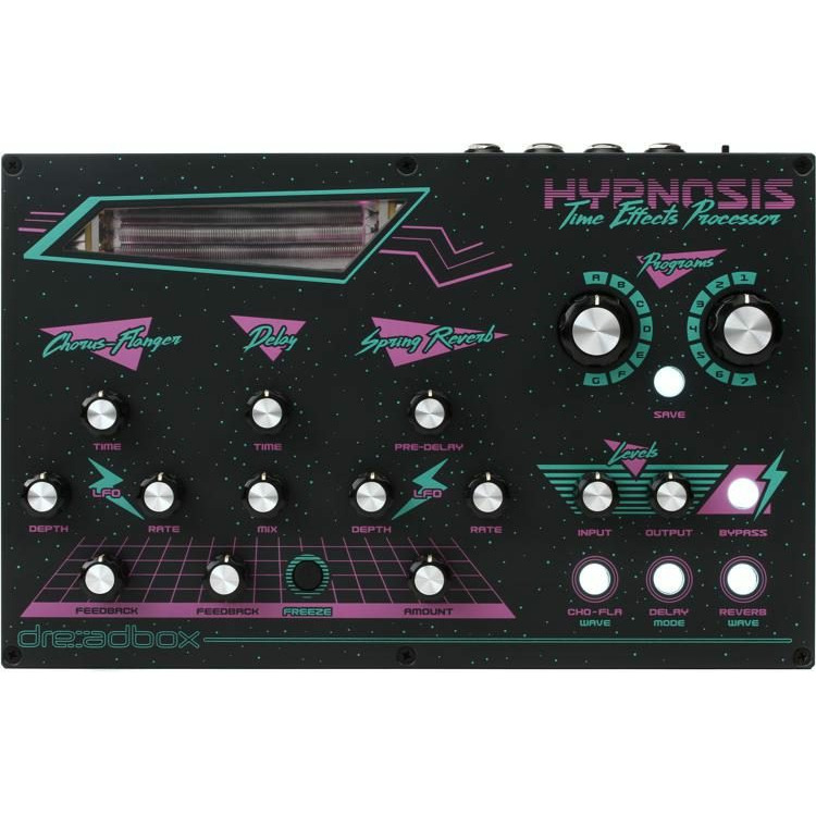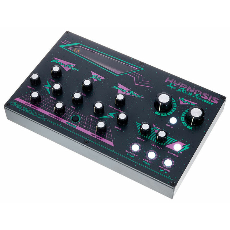 Dreadbox Hypnosis - процессор эффектов, созданный под вдохновением от аналоговых эффектов восьмидесятых. Hypnosis идеально подходит для работы с гитарой, синтезаторами или голосом. Процессор имеет 3 независимых эффекта: хорус-фленджер, дилэй и ревер. Секция аналогового пружинного ревера включает в себя танк с тремя пружинами и уникальный модуль питч модуляции. Аналоговый BBD хорус-флэнджер дополнен тремя вариантами LFO. Секция цифрового стерео-дилея имеет три вида задержки и функцию freeze. Прибор имеет память на 49 пресетов.