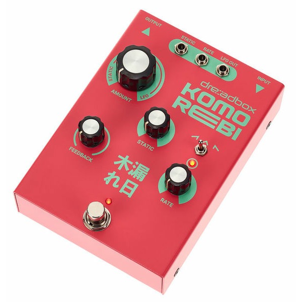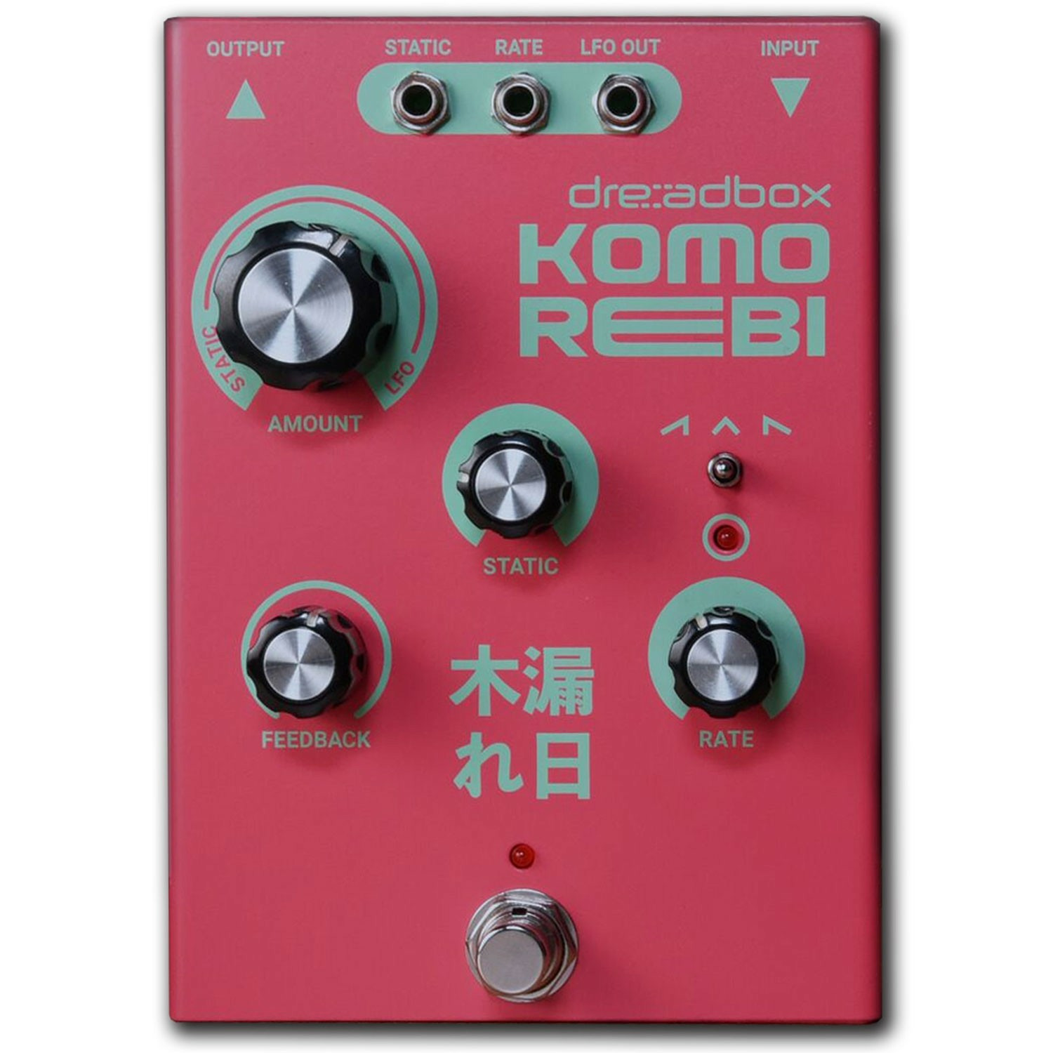 Dreadbox Komorebi - универсальная гибридная аналоговая BBD педаль хорус/флэнджер с тремя формами волны LFO. Педаль разработана с учетом возможности применения с разными инструментами - помимо стандартных джеков для гитар и синтезаторов имеются три разъема для использования с модульными синтезаторами формата Eurorack, позволяющие создавать различные конфигурации подключения. Два разъема позволяют управлять параметрами Static и Rate, а третий является выходом LFO. Время прохождения сигнала в цепи BBD увеличено с 2 до 30 мс. Имеются ручные регуляторы Amount, Feedback, Static, Rate, а также кнопка переключения формы волны LFO. Питание педали осуществляется от адаптера 15 В DC.