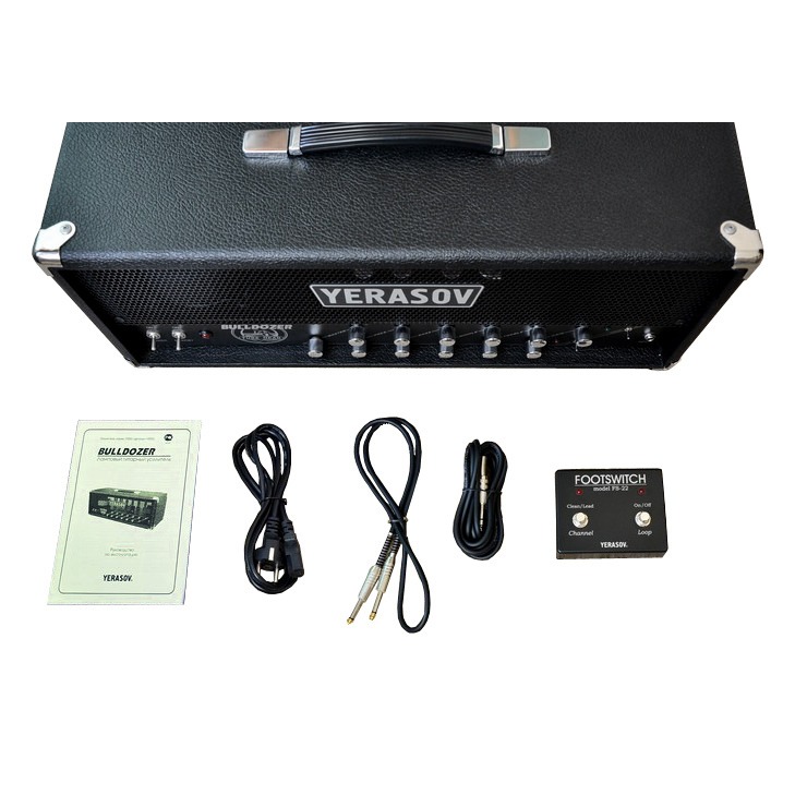 Yerasov BULLDOZER-EL Усилитель гитарный ламповый. BULLDOZER оснащен отдельным корпусом, что позволяет подключать его к различным кабинетам. У усилителя 2 канала и 6 режимов работы: Orange – четыре режима : Vintage Clean, Vintage High Gain, Modern Clean и Modern High Gain и Red – два режима : Vintage High Gain и Modern High Gain. Блок питания с двумя типами выпрямления : «быстрое» полупроводниковое и компрессирующее ламповое. Лампы: предусилитель 5 х 12АХ7, усилитель 4 х EL34. Регулировки Gain, Bass, Middle, Treble, Presenсe, Master на каждом канале. Последовательная петля эффектов. Ножной переключатель с индикацией режимов работы. Мощность 100Вт. В комплекте ножной переключатель FS-22 и кабель 1 метр. Вес 18,5 кг.