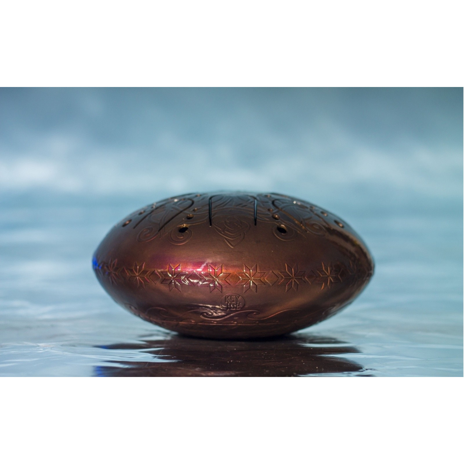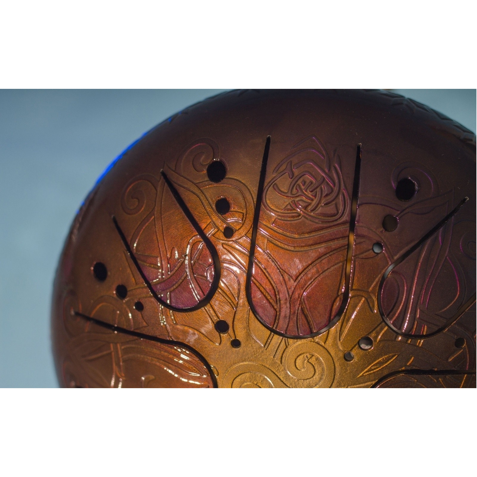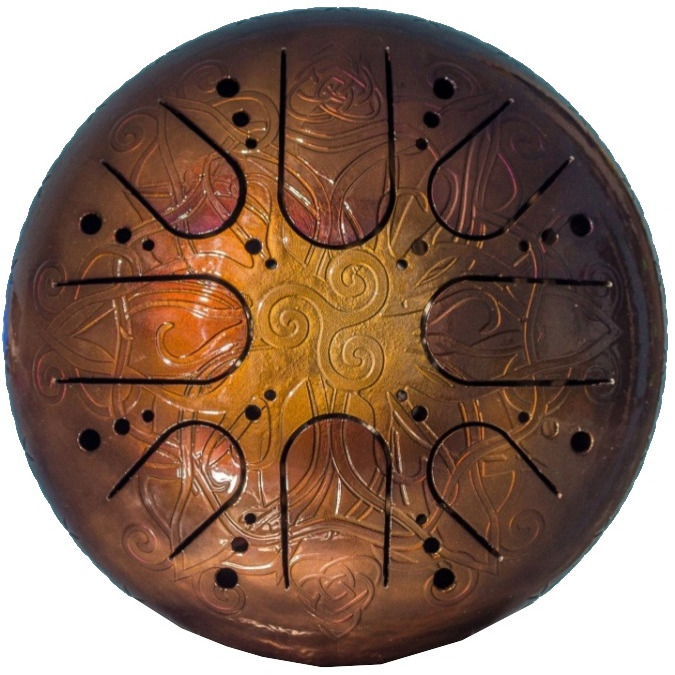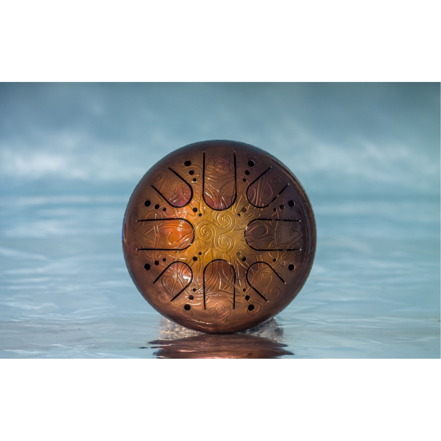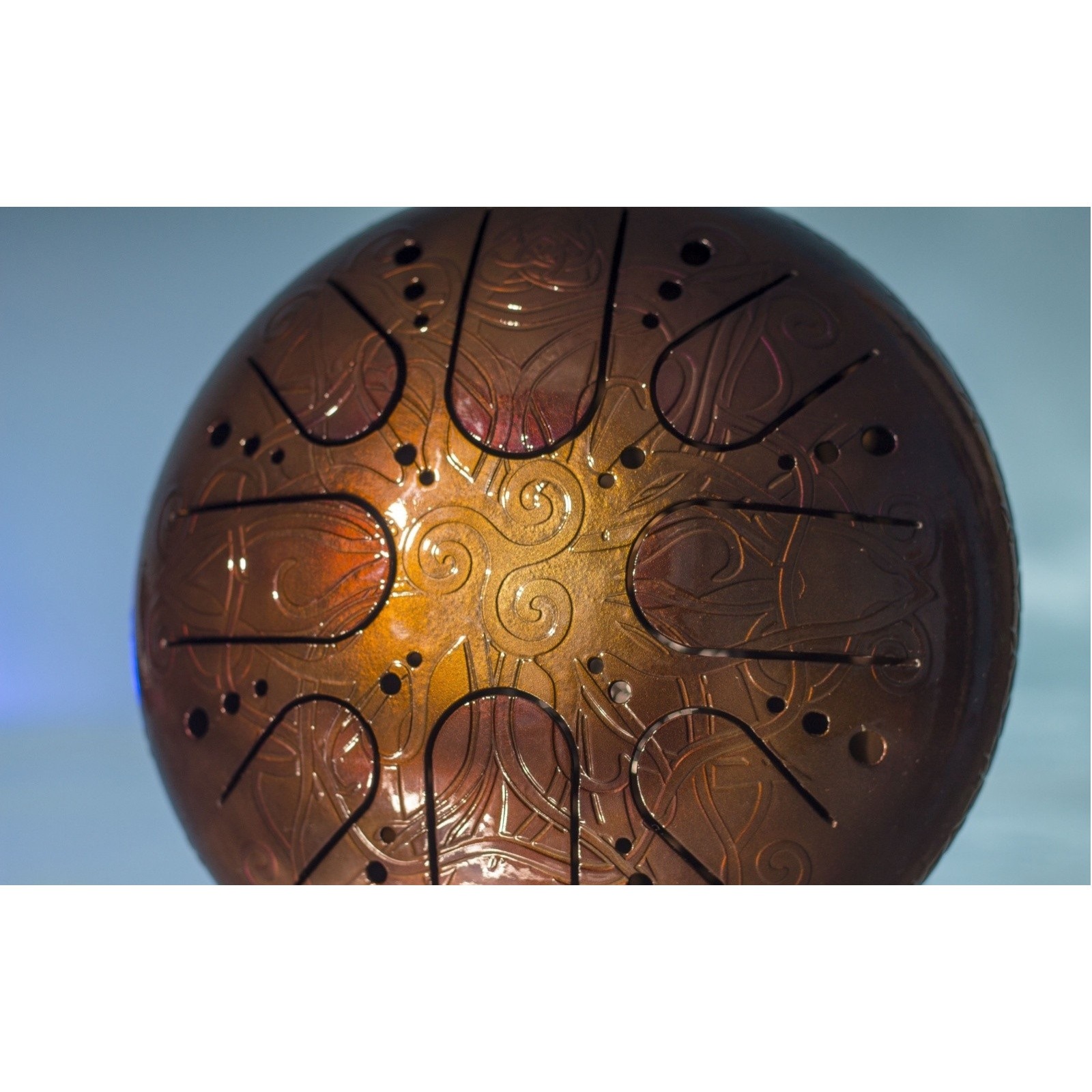 Звук у глюкофона - мелодичный и звонкий. Тонкий металл корпуса позволяет мастеру настроить чистые и высокие ноты. Благодаря небольшому размеру и весу инструмента, его легко брать с собой на природу, прогулку или в путешествие. Играть на глюкофоне можно пальцами или палочками с мягкими наконечниками. Цвет золотисто-оранжевый с фиолетовым/