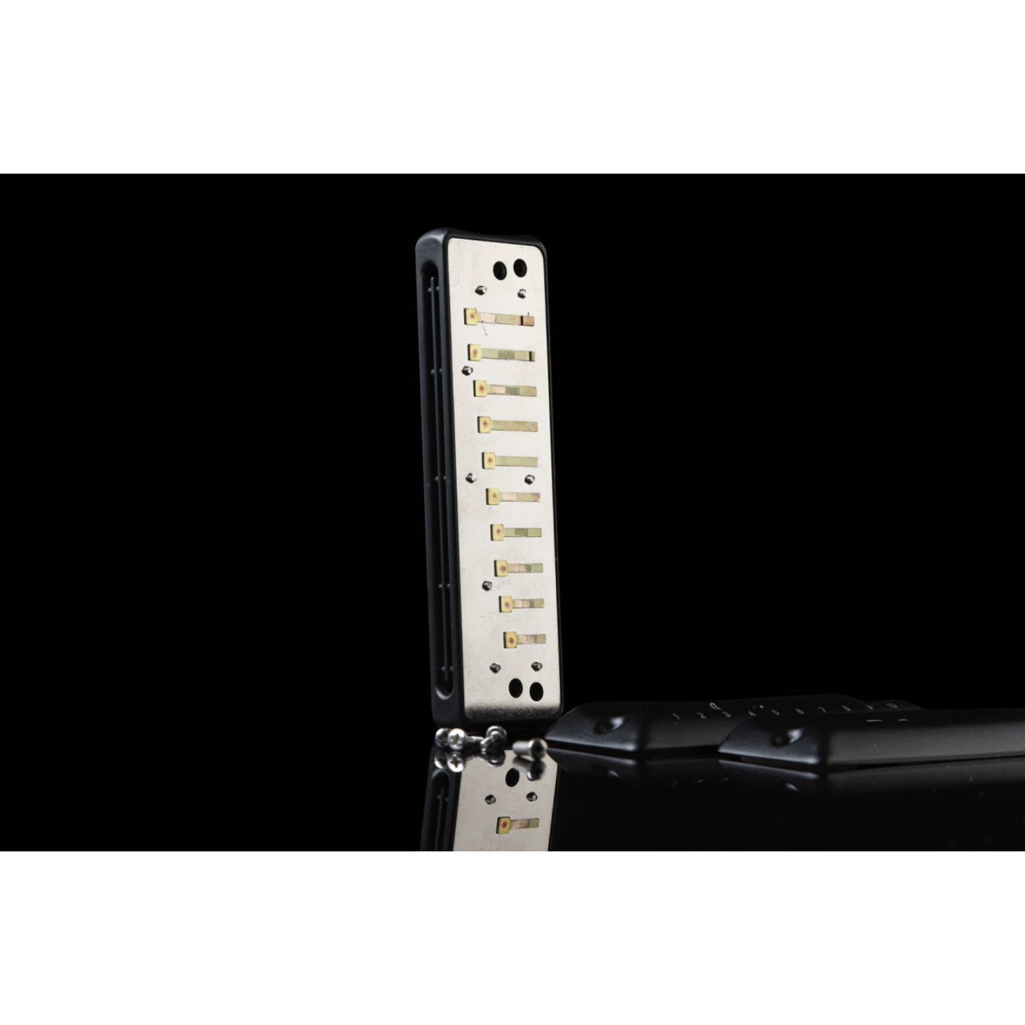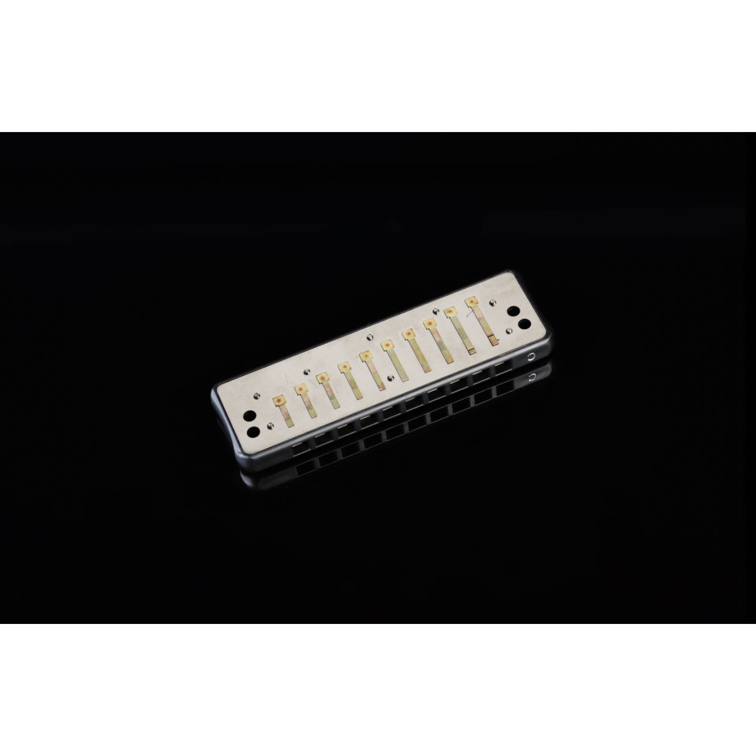 Язычковая пластина из латуни толщиной 1,2 мм и 20 язычков из фосфорной бронзы. Язычки проходят низкотемпературную обработку, что делает их идеально ровными и герметичными. Это облегчает передувы и обеспечивает точную и быструю реакцию на любую технику.
