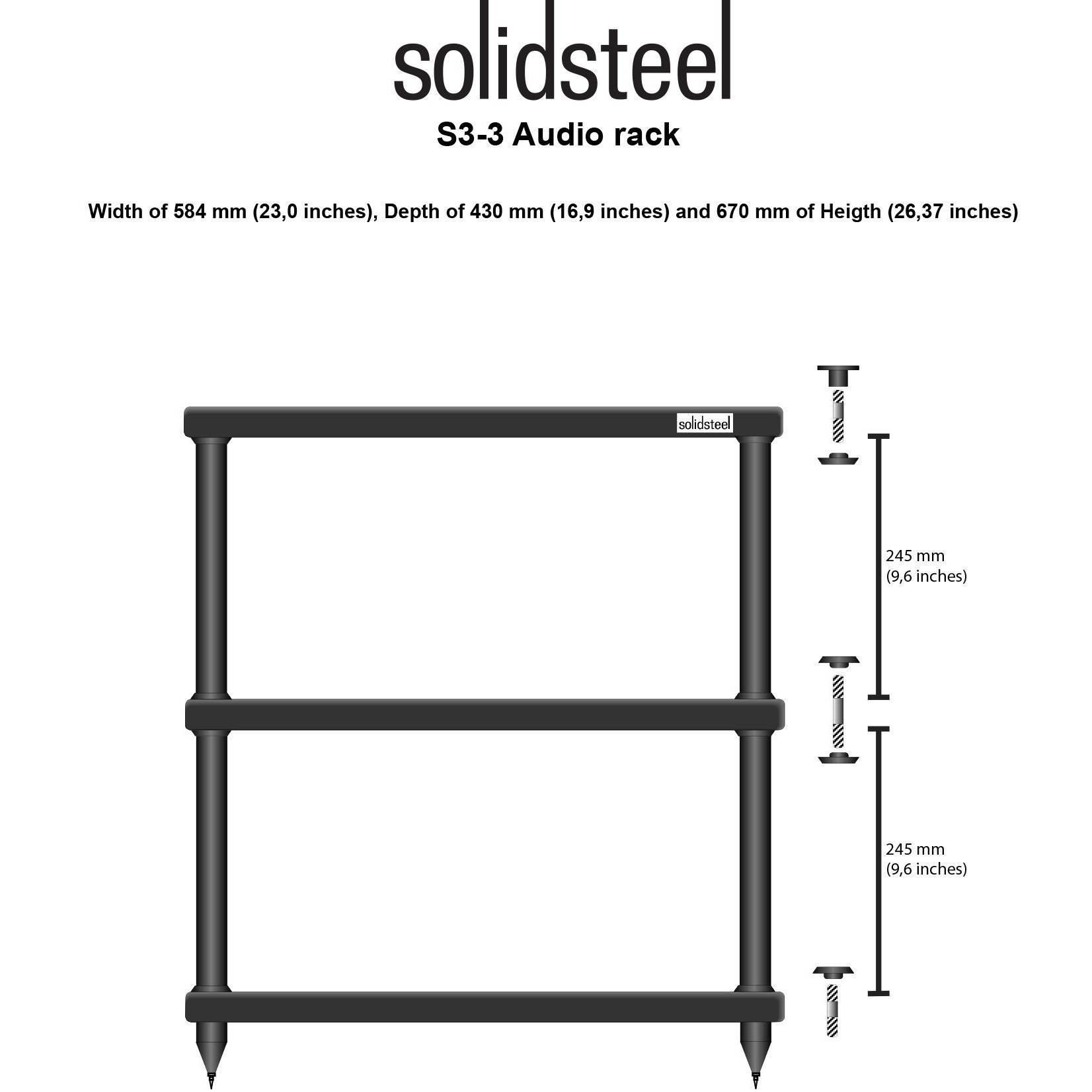 Solidsteel S3-3 - стойка под аппаратуру предназначена для размещения Hi-Fi компонентов. Стойки тумбы изготовлены из анодированного алюминия чёрного цвета, заполненные демпфирующем материалом. Полки изготовлены из ламинированного MDF цвета орех. Допустимая нагрузка на каждую полку: 60 кг. Габаритные размеры (ШхВхГ): 584 мм х 670 мм х 430 мм. Требует самостоятельной сборки.