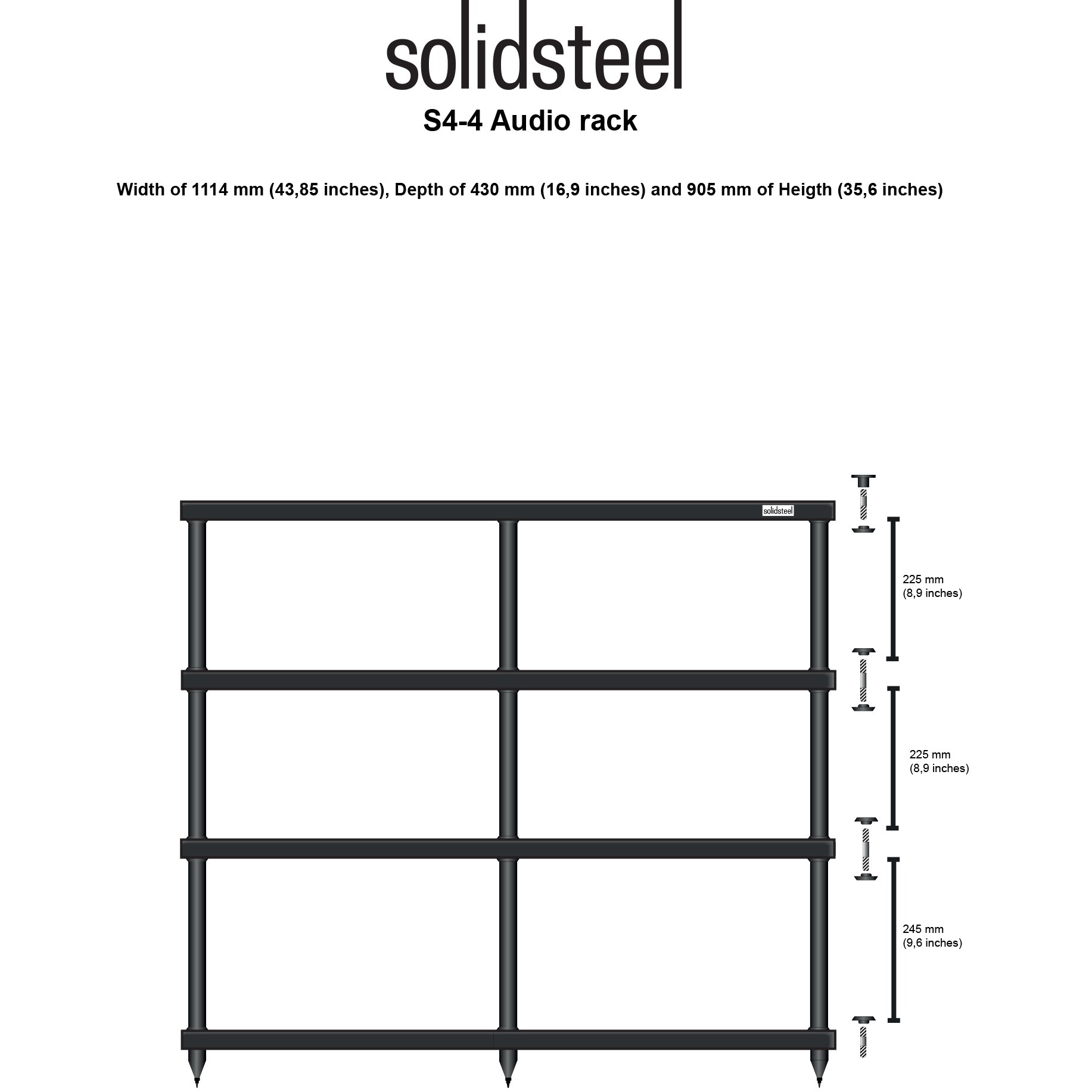 Solidsteel S4-4 - это 4-х полочный стенд для аппаратуры hi-fi, аудио и видео аппаратуры, который обладает превосходными характеристиками и привлекательным внешним видом при весьма конкурентоспособном соотношении цена-качество.