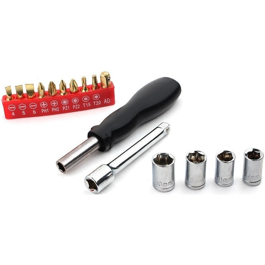 - Содержит популярные биты, такие как гаечные головки, Pozidriv, Phillips, и т.п.