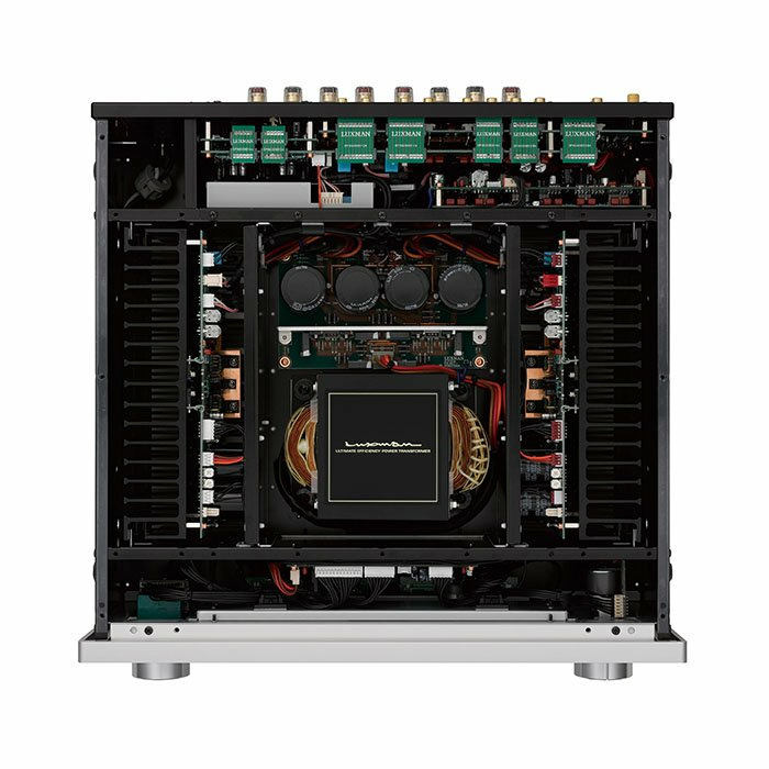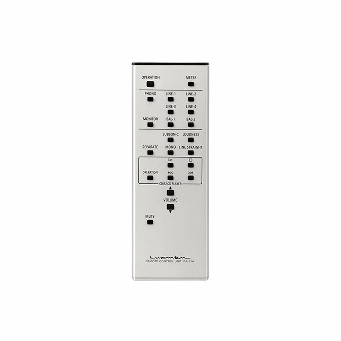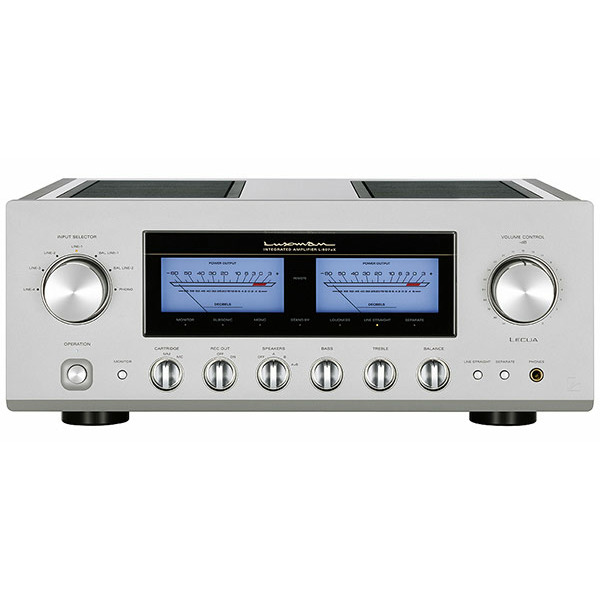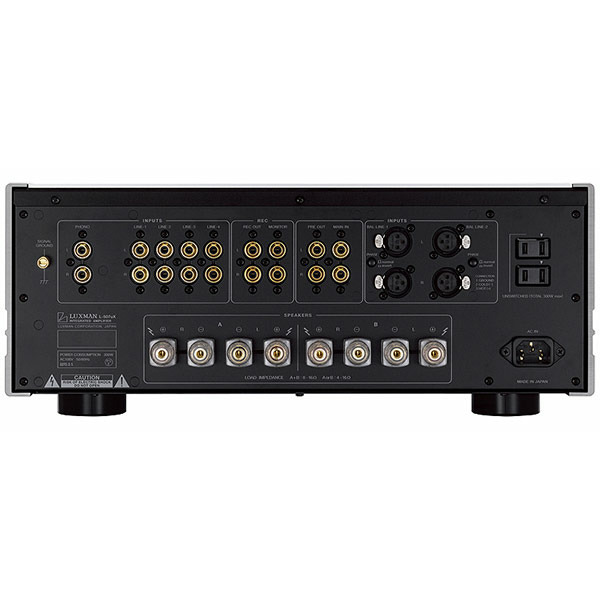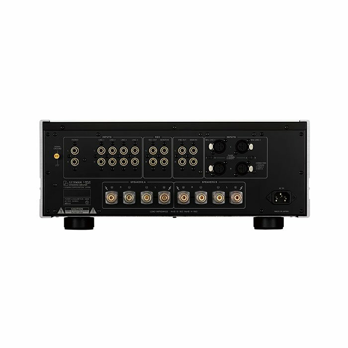 Входы: два балансных XLR с кнопками инвертирования фазы, 4 линейных RCA, вход MM/MC-фонокорректора, RCA для мониторинга записи и RCA для подключения к оконечной секции (актуален при работе усилителя в составе ДК и для организации би-ампинга). Выходы: для записи (RCA) и PRE OUT (RCA). Имеются четыре пары винтовых терминалов для АС, пара розеток для периферийных устройств с общей потребляемой мощностью не более 300 Вт и заземляющая клемма. В комплект входит алюминиевый пульт ДУ, который может управлять CD-проигрывателями Luxman.