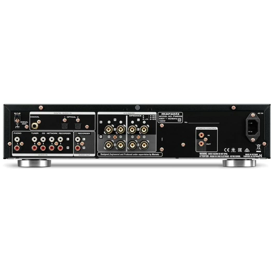 В цепи Marantz PM6006 black интегрированы дискретные усилительные модули HDAM SA2 и HDAM SA3. Изменения коснулись выходной секции, которая обеспечивает теперь более высокие пиковые токи. В итоге звучание стало более точным, детальным и динамичным. Усилитель укомплектован отборными комплектующими. Крупный тороидальный трансформатор блока питания имеет низкий импеданс и помещен в экранирующий кожух. В БП также установлены сильноточные конденсаторы и ультрабыстрые диоды Шоттки. Модель использует обратную связь по току, с помощью которой удается минимизировать искажения, расширить частотный диапазон, получить отличные переходные характеристики и в комбинации с мощным БП обеспечить уверенную работу даже с капризными в плане импеданса АС. Мощность Marantz PM6006 составляет 2 х 60 Вт (4 Ом) и 45 Вт на канал при 8 Ом.