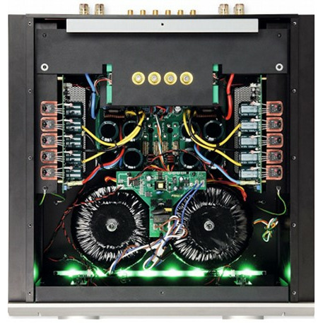 Стереоусилитель Musical Fidelity NU-VISTA 800 имеет мощность 2х300 Вт, блок питания с интегрированным трансформатором на 1.5 кВт, может отдавать нагрузку в пике до 200 А. На корпусе аппарата есть четыре небалансных и два балансных входа, а также выходы, частотность которых можно регулировать. Пользователю доступны две пары винтовых выходов.