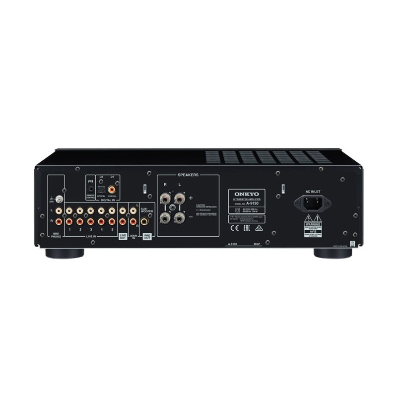 Усилитель Onkyo A-9130 оснащен жестким шасси толщиной 1,6 миллиметров, и в сочетании с большими антивибрационными ножками он практически лишен нежелательного резонанса. Новый дисплей показывает значение активного входа. Высококачественные терминалы для подключения громкоговорителей обеспечивают фиксированное соединение кабелей. Большие прозрачные винтовые клеммы расположены далеко друг от друга и легко доступны,они изготовлены из немагнитного материала для предотвращения помех. Из аналоговых входов доступны MM Phono и пять позолоченных разъемов RCA, также имется выход с предусилителя и вход на мощник. Мощность усилителя составляет 2 x 60 Вт.