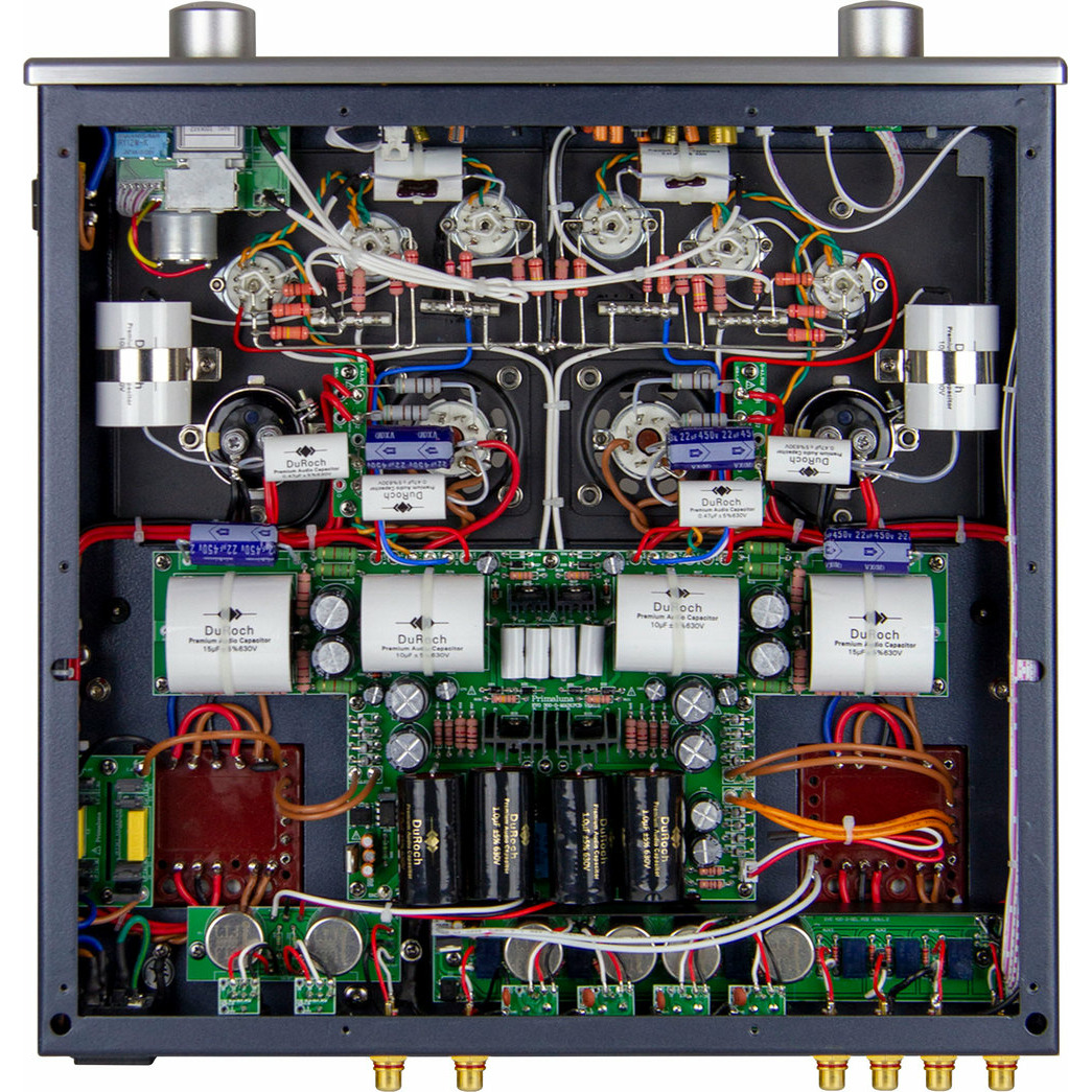 В схеме усилителя PrimaLuna EVO 400 Integrated используются только отборные компоненты высокого качества, такие как музыкальные и особо линейные японские резисторы TAKMAN с малым уровнем шумов, заказные тороидальные силовые трансформаторы в массивных корпусах, широкополосные выходные трансформаторы собственной намотки, ; керамические ламповые панельки; регулятор уровня громкости от ALPS; конденсаторы от Nichicon и DuRoch; супербыстрые диоды Philips; массивные позолоченные колоночные клеммы конструкции WBT (все клеммы фрезерованы из меди и не имеют внутренних полостей – для лучшей проводимости и повышенной надежности); позолоченные входные RCA разъемы на панели.