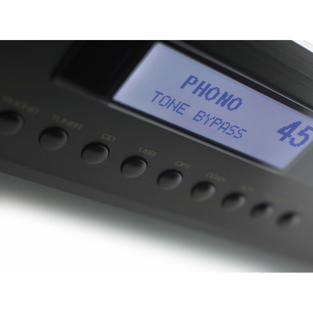 Дизайн модели отличается аккуратностью и чистотой линий. В центре алюминиевого фасада расположен LCD-дисплей и 9 кнопок селектора источника. Левая часть занята кнопкой питания с LED-диодом, USB с поддержкой Apple-устройств, мини-джеком для наушников и кнопками для выбора комплектов АС. Вправо вынесена ручка громкости и клавиши для работы с меню (настройка тембров, баланса, отключение темброблока и др.).