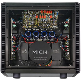 По своей архитектуре X5 достаточно близко следует существующей комбинации из предусилителя/усилителя мощности Michi P5/S5 и аналогично питается от двух крупногабаритных тороидальных трансформаторов собственного производства, что позволяет X5 выдавать до 600 Вт мощности на 4 ом и 350 Вт на 8 ом с почти безграничной, но контроли- руемой басовой энергией.