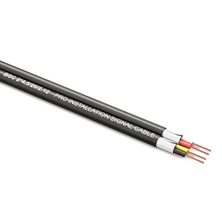 PROCAST Cable BSC2*4,5/20/0,12 – профессиональный двухканальный балансный сигнальный межблочный звуковой кабель для межблочной коммутации и фиксированных кабельных сигнальных трасс. Предназначен для передачи двух аналоговых балансных (моно) сигналов, балансного стереосигнала или балансного моно-сигнала и питания 12/24V для внешнего коммутационного устройства или плеера. Например, настенных зональных панелей CVGAUDIO серии PW и плееров CVGAUDIO N-SRC. Также кабель может использоваться как микрофонный для фиксированной инсталляции - при прокладке в слаботочных лотках или в запотолочном пространстве в гофротрубе. Внешний размер кабеля – 4,5mm х 9mm, внешняя изоляция – черный PVC пластикат. Структура кабеля – два раздельных канала в каждом из которых по две изолированные много-проводниковые сигнальные жилы с экраном. Каждая жила состоит из 20 проводников диаметром 0.12mm. Изоляция жил первого канала – желтый и черный, второго канала – красный и белый. Материал изоляции - XLPE сшитый полиэтилен. Внешний экран (индивидуальный для каждого канала) – алюминиевая фольга и закороченный с экраном жгут из 7 луженый проводников диаметром 0.18mm каждый. Данный жгут позволяет очень удобно припаивать или фиксировать экран к устанавливаемому коннектору. Все проводники изготовлены из чистой безкислородной меди OFC – 99.97%. Размер бухты кабеля – 200 метров, это позволяет использовать длинные безшовные трассы, например для подключения удаленных зональных панелей CVGAUDIO серии PW.