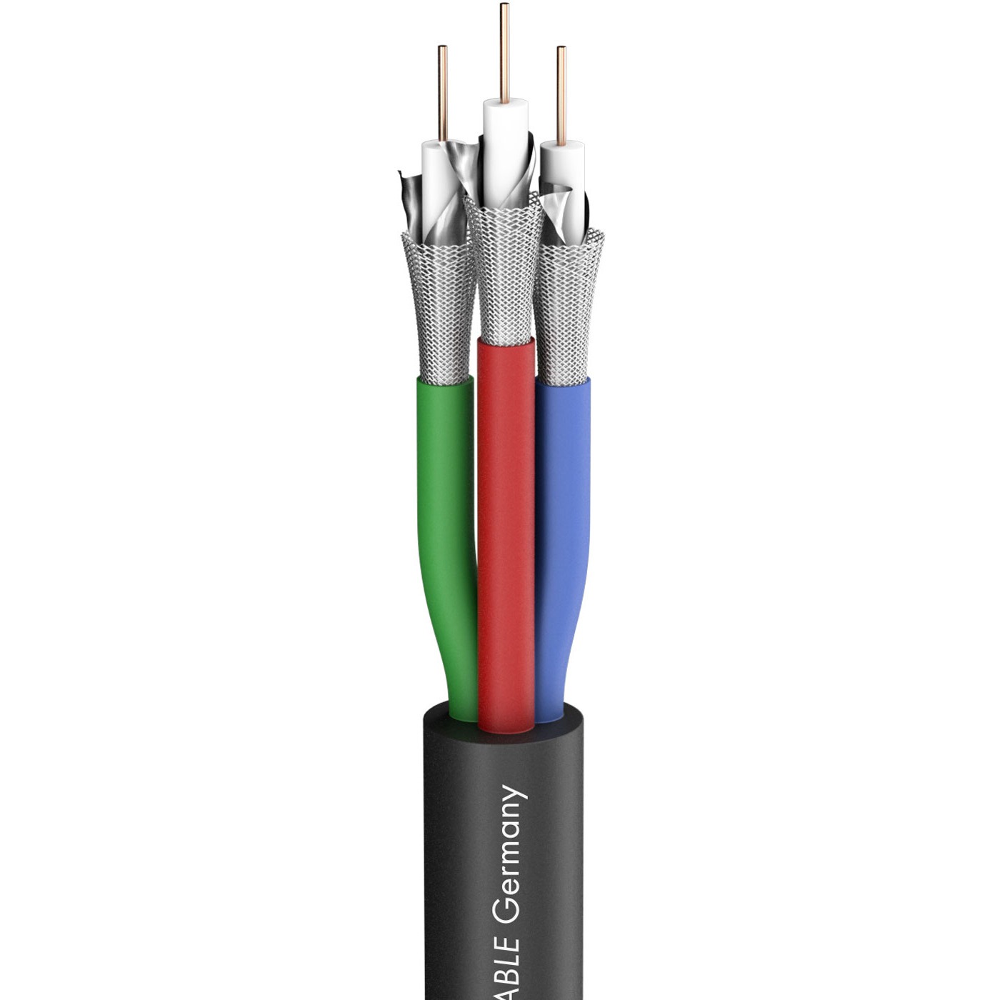 600-0851-03 - трехканальный видео кабель серии TRANSIT 3 HD. Под одной черной ПВХ оболочкой диаметром 11,2 мм расположено три независимых коаксиальных кабеля. Каждый коаксиальный кабель имеет комбинированный экран (медный плетеный + алюминиевая фольга (AL/PT), волновое сопротивление 75 Ом и емкость жила/экран 55 пФ на 1м. Благодаря пониженному затуханию сигнала, по кабелю возможно передавать цифровые данные на большие расстояния. Максимальная дальность передачи: SDI - 180 м, HD-SDI - 120 м, 3G - 60 м. Отличается стабильностью и устойчивостью параметров к «старению» при долговременной эксплуатации в неблагоприятных климатических условиях. Кабель имеет высокую гибкость и устойчивость к ультрафиолетовому излучению. TRANSIT 3 HD рекомендуется использовать для передачи сигнала на расстояния свыше 40 метров. В профессиональных видео студиях может применяться и на коротких дистанциях, что гарантирует передачу изображения абсолютно свободное от помех.