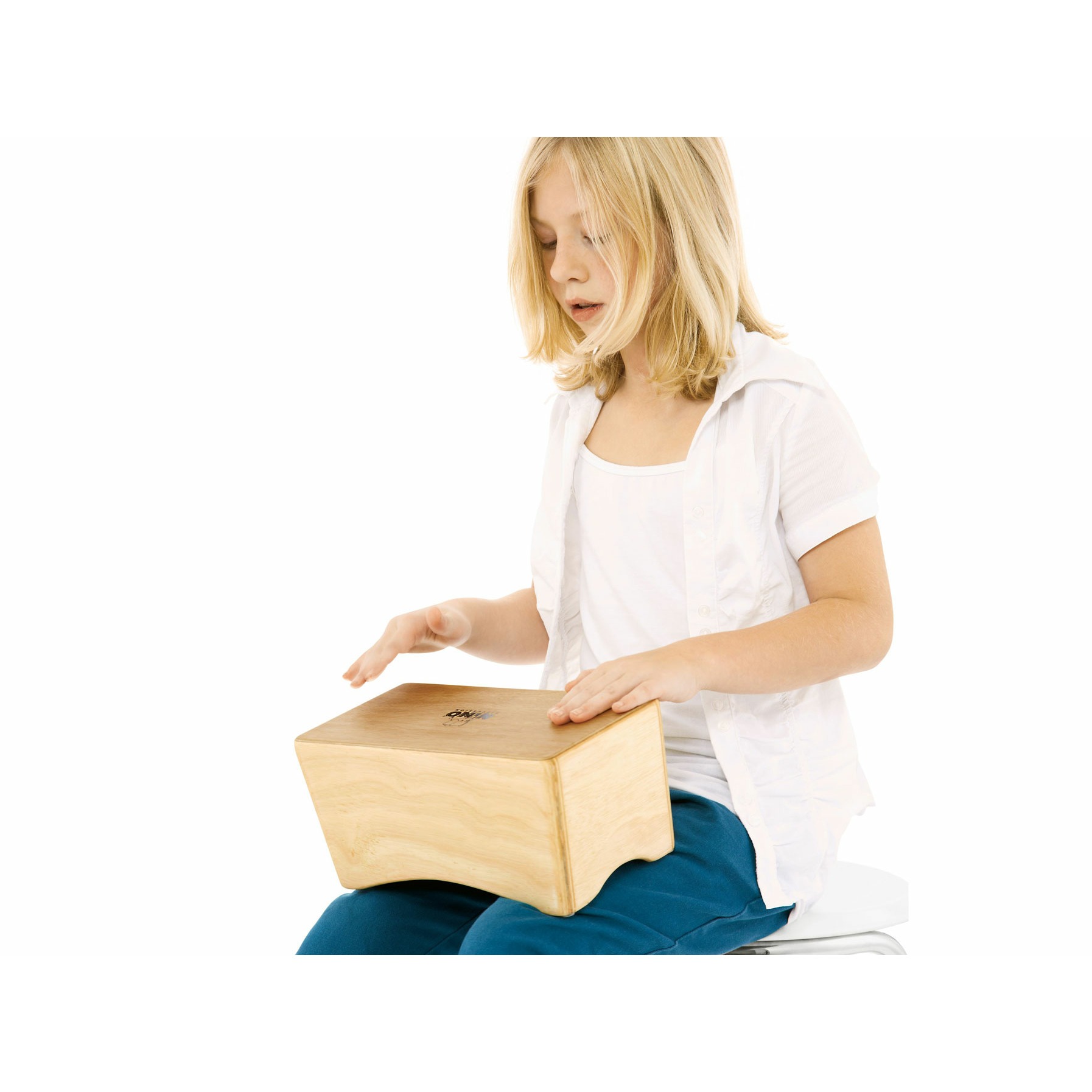 Nino Percussion Bongo Cajon - этот кахон имеет прекрасное звучание и отлично подходит для детей. Бонго кахон с отличным звучанием и размером, подходящим для детей. Игровая поверхность разделена на две части с более низким и высоким звучанием, как традиционный бонго. Инструмент можно удерживать между коленей или ставить на пол.