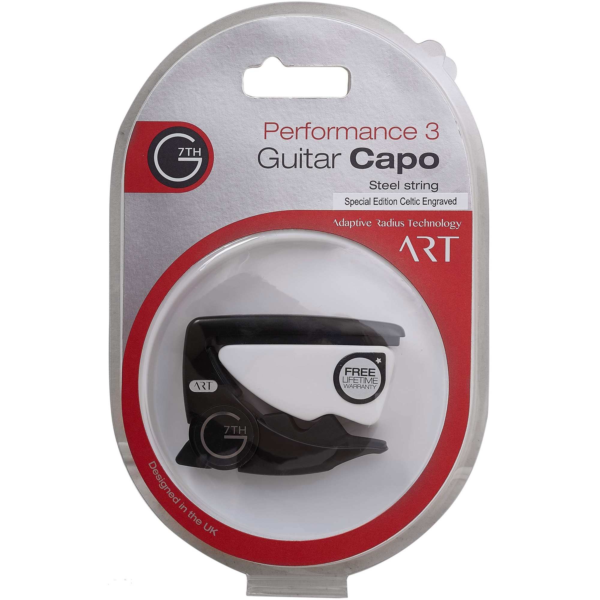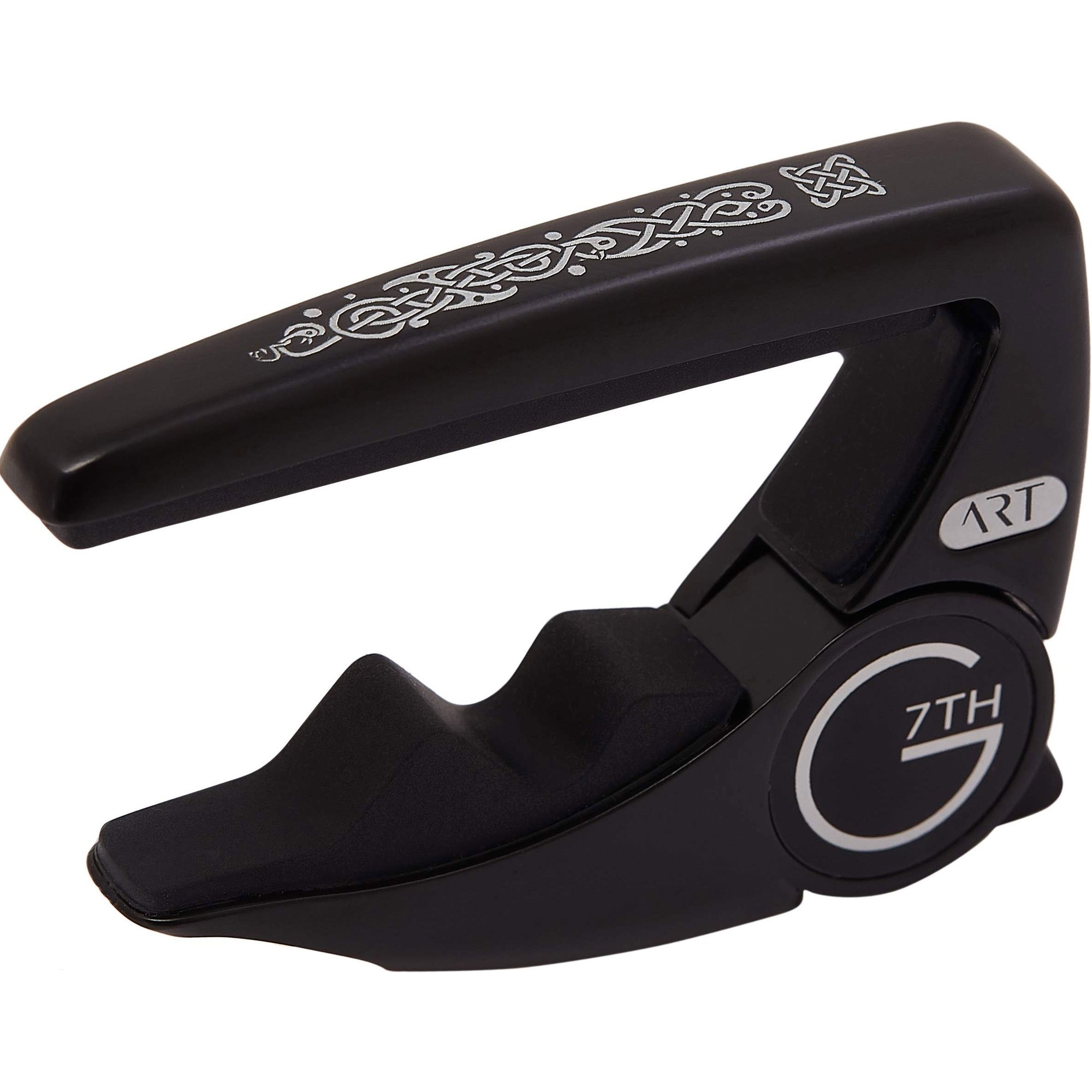 G7TH Performance 3 6st Celtic – каподастр для шестиструнной гитары. Позволяет быстро сменить высоту строя гитары, не перенастраивая струны. Важная особенность – это использование технологии Adaptive Radius Technology (ART). С ее помощью каподастр адаптируется к изгибам накладки и струн, равномерно прижимая последние. Захват и пэд сделаны из силиконовой резины, благодаря чему каподастр не царапает гриф гитары. Performance 3 6st Celtic выполнена в черном цвете с гравировкой в кельтском стиле.