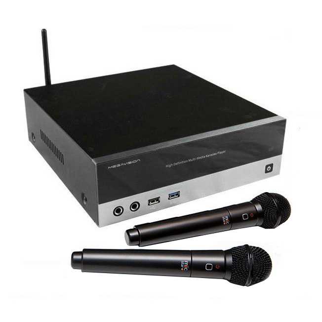 Miic Star Megavision HD2 - это многофункциональный медиаплеер с функцией караоке. Он может воспроизводить аудио, видео и фото файлы. Вы можете подключить к нему до 4 микрофонов, при этом в комплекте вы найдете два проводных и два беспроводных микрофона. С помощью встроенного микшера вы можете регулировать отдельно уровень громкости каждого микрофона, уровень громкости воспроизводимой музыки, управлять темпом и тональностью песни. Также на вокал можно наложить эффекты эха и дилэя. Эквалайзер и компрессор помогут получить оптимальный звук для любого помещения. В случае, если это позволяет фонограмма, вы можете воспользоваться функцией отключения вокала. К песням можно подключать свои видеофайлы и фотографии в качестве фона. В устройстве установлен жесткий диск объемом в 1 терабайт, на который вы можете записывать свои медиафайлы. При желании вы можете записать свое вокальное исполнение на жесткий диск с возможностью в дальнейшем экспортировать запись на внешний носитель. Систему можно подключить к телевизору через порты HDMI или RCA, и подключить к аудио усилителю через порт RCA. Кроме того вы можете управлять этим медиаплеером удаленно с Android-устройства. Караоке-система Miic Star Megavision HD2 - отличное решение для развлечения в барах и ресторанах