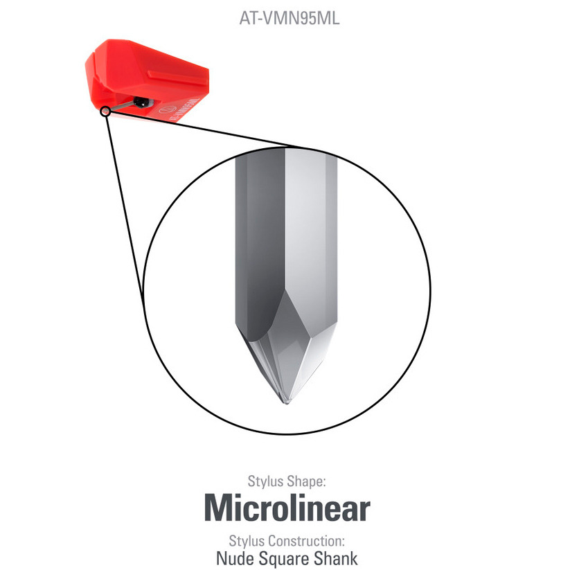 Audio-Technica AT-VM95ML – четвертая по стоимости головка звукоснимателя в новой линейке, но её в любой момент можно апгрейдировать до верхней головки простой заменой иглы. То есть, вы всегда сможете выбрать самую продвинутую заточку из VM95 серии: Shibata. Любая игла изнашивается по мере проигрывания пластинок, поэтому так важно иметь возможность приобрести сменную иглу. Приблизительный срок службы микролайн иглы AT-VMN95ML – около 1000 часов.