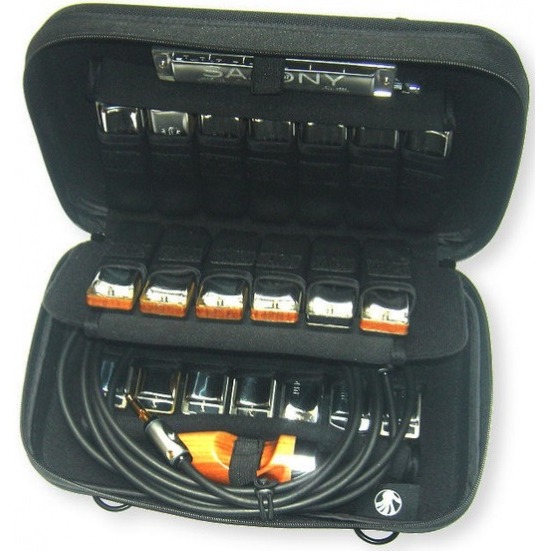 Средний ряд, вмещающий 6 гармошек, можно вытащить и использовать как отдельный чехол или даже как поясную сумку. Две дополнительные ленты-липучки удерживают две большие (хроматические) гармошки или микрофоны с длинными корпусами. Если вы заполняете два верхних ряда 13 инструментами, то внизу остается достаточно места для микрофона для губных гармошек и кабеля.