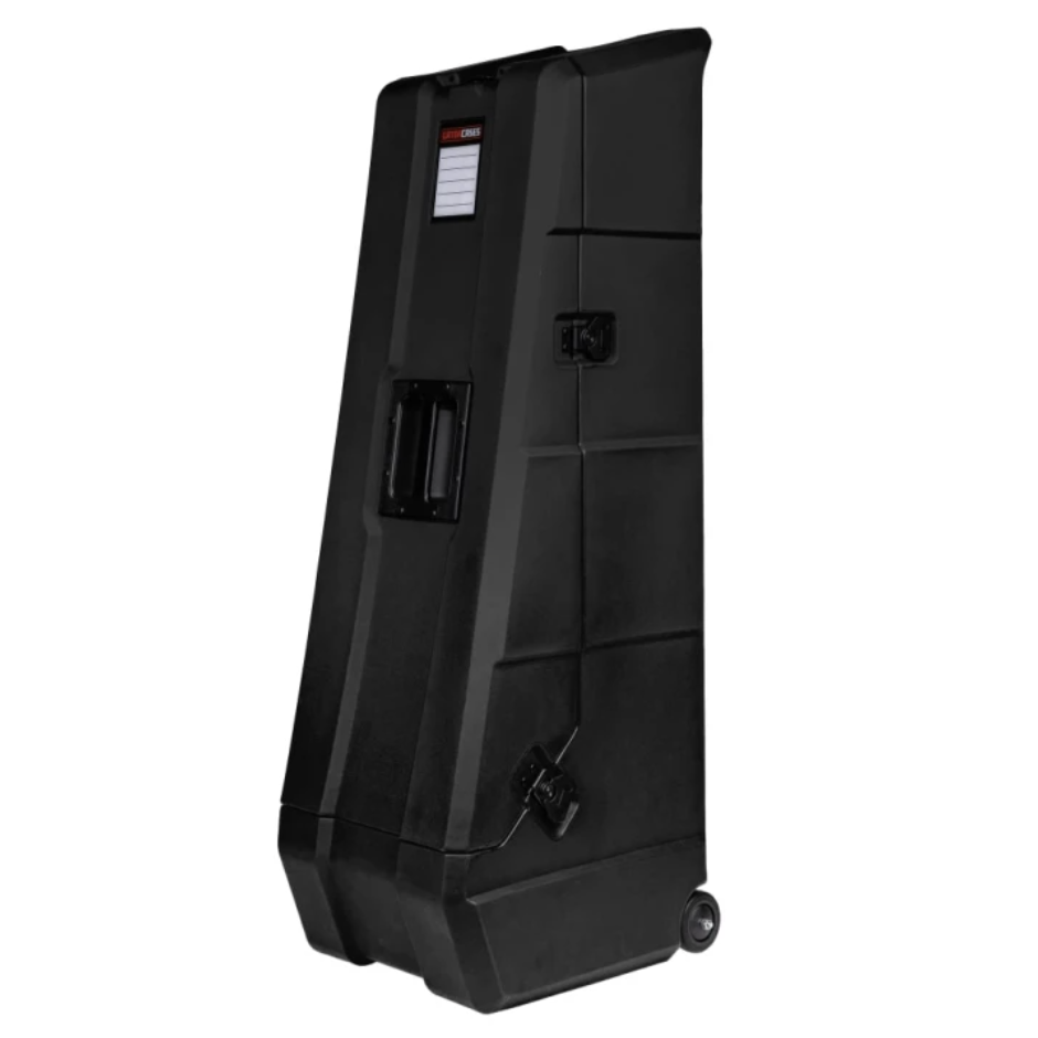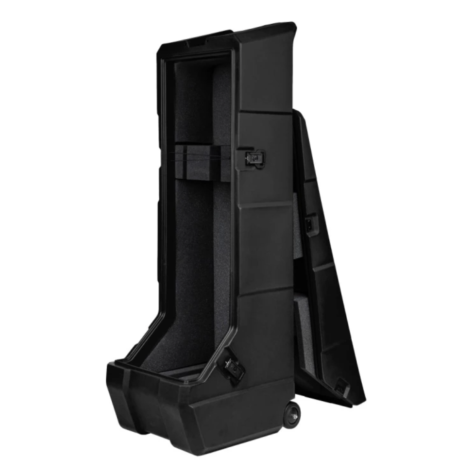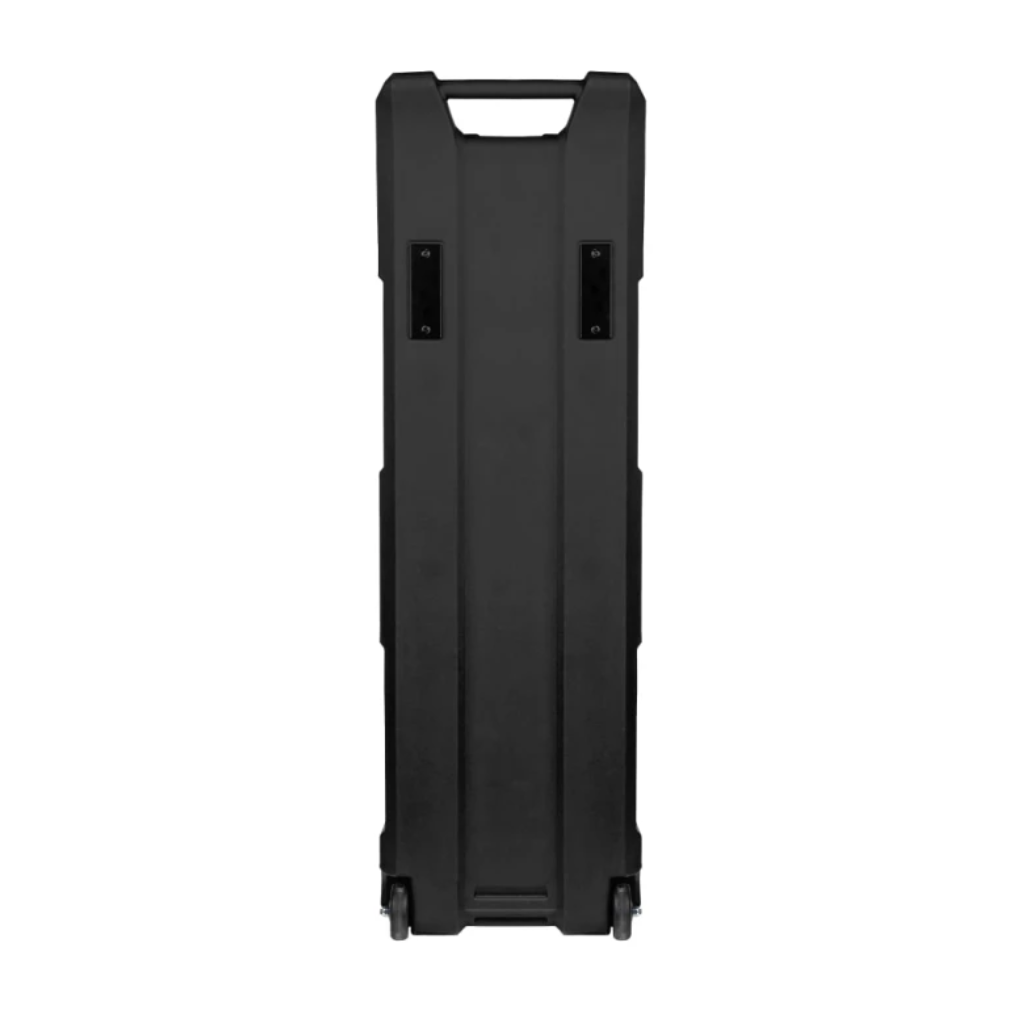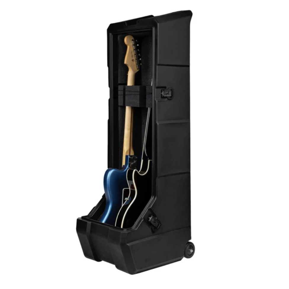 Кейс-стойка для двух электрогитар с колёсами. Модель сочетает функции транспортировочного кейса и сценической стойки, что делает её удобной для гастролей, репетиций и хранения инструментов.