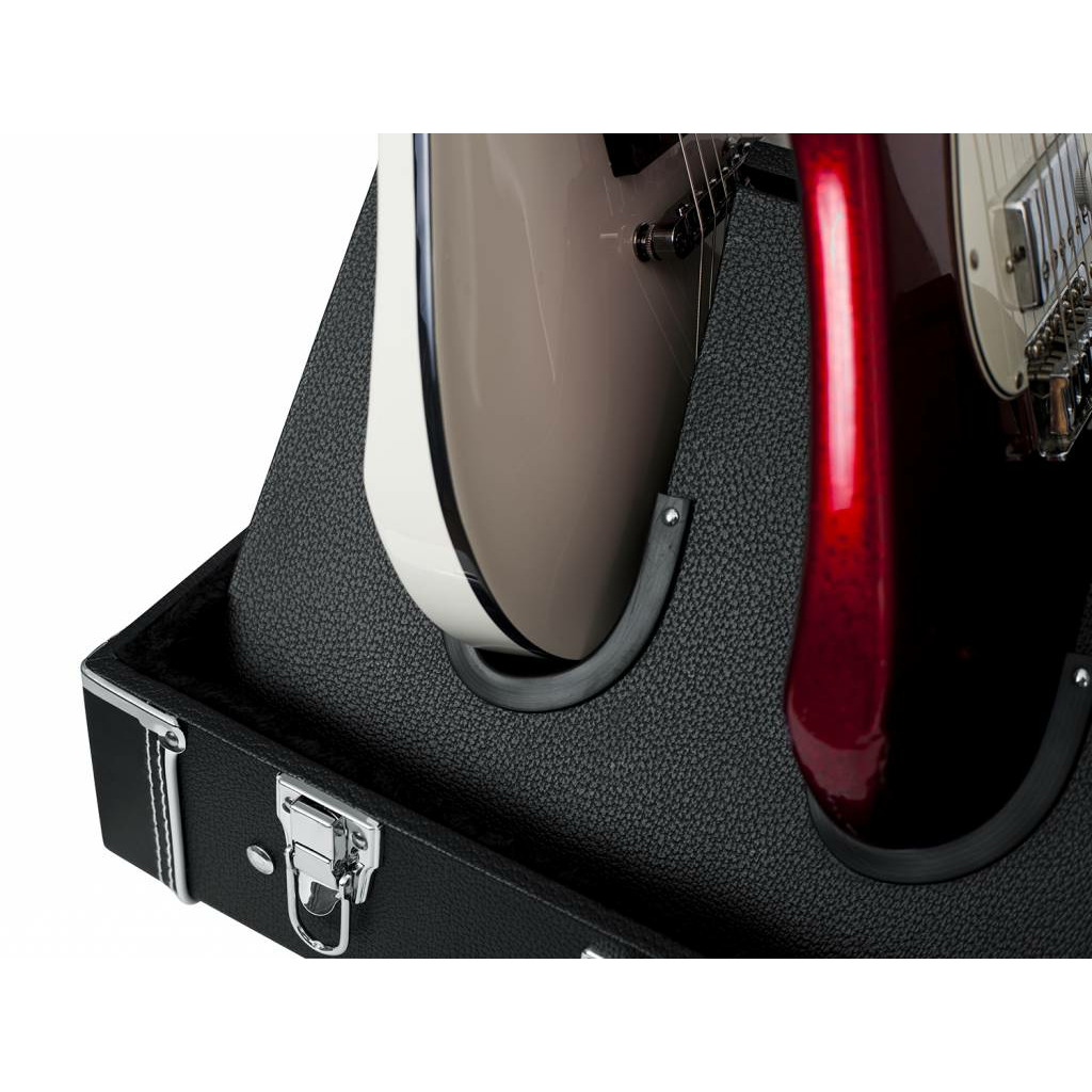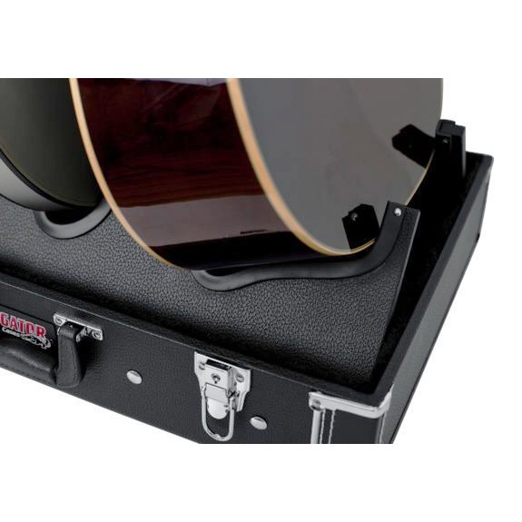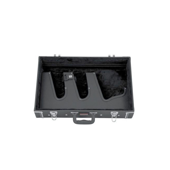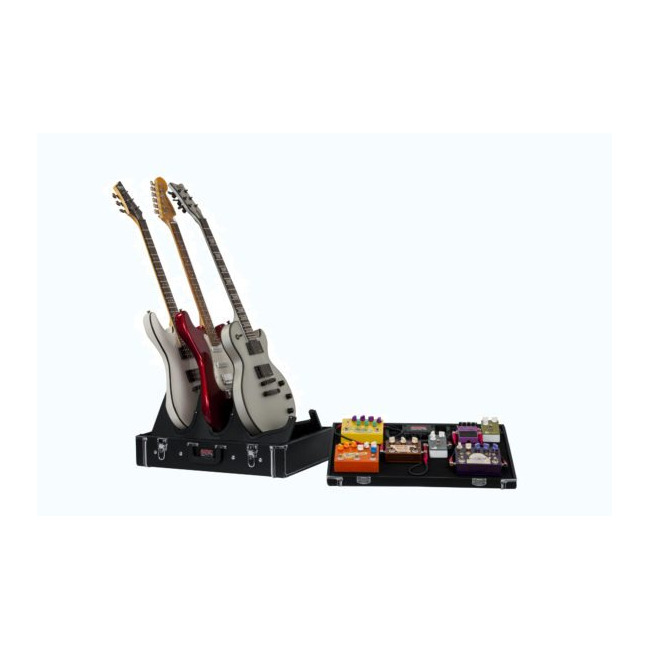 GATOR GW-GIGBOXJR - уникальный кейс гитариста. Крышка преобразуется в стенд для 3х электрогитар или 2 электрогитар и 1 акустической гитары посредством установки а нее пластикового держателя. Педали крепятся на основании посредством "липучки". В независимости от того, на какой гитаре вы играете, вы хотите защитить свой драгоценный инструмент. В этом вам поможет фирменный кейс от GATOR. Он обладает достаточной прочностью и демократичным дизайном – простой черный корпус без каких-либо излишеств. Корпус сделан из прочного черного пластика, который защитит ваш инструмент от практически любых повреждений - от физического воздействия и природных факторов (снег, дождь). Закрывается кейс на крепкую крепкую защелку, а для переноски предусмотрены удобная ручка.