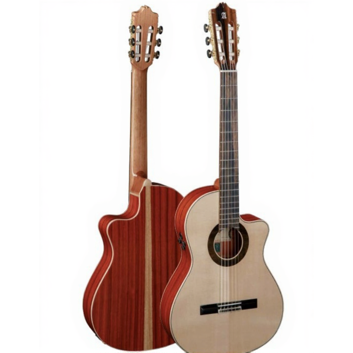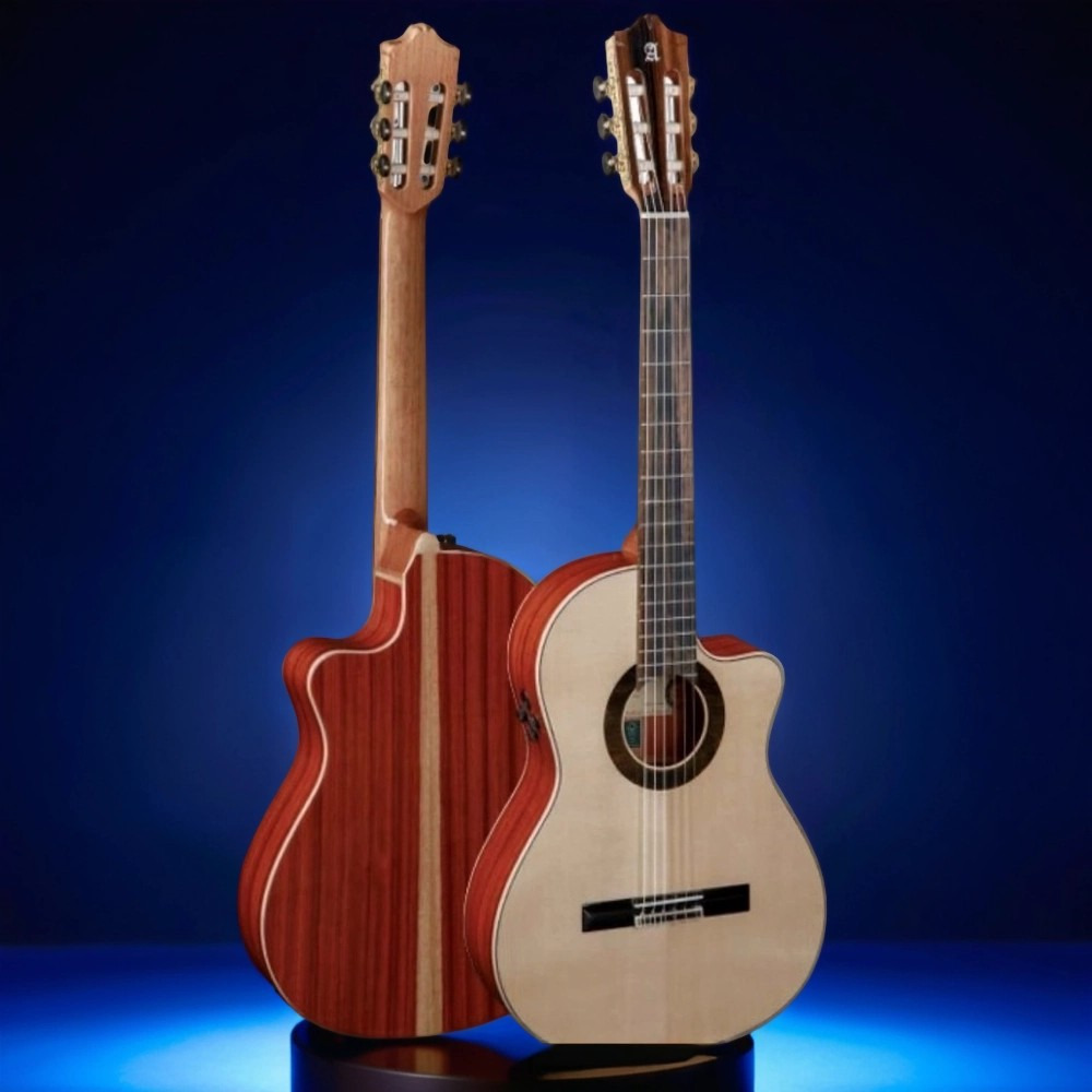 Классическая гитара со звукоснимателем, созданная брендом Alhambra в рамках линейки Green Sustain. Эта модель сочетает традиции испанского гитарного мастерства с экологичными технологиями производства: все используемые породы дерева сертифицированы FSC 100%.