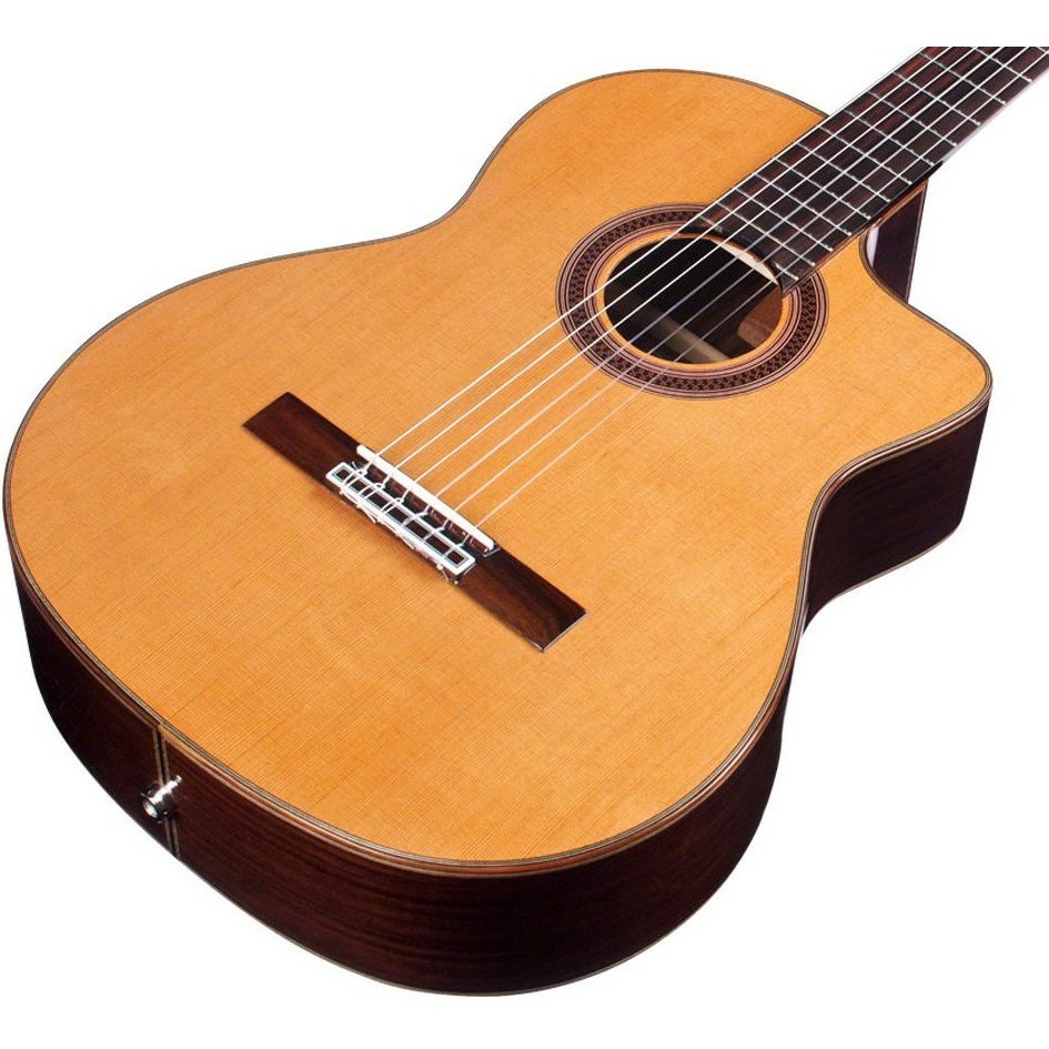 Дека инструмента сделана из массива красного кедра с вырезом под руку, обечайка и нижняя дека - палисандр, бридж изготовлен из палисандра. Гриф сделан из махагони с накладкой из палисандра, размер верхнего порожка составляет 50 мм. Количество ладов грифа - 19. Мензура гитары составляет 650 мм (25 1/2"), цвет натуральный. Установлен комплект струн Savarez Cristal Corum High Tension 500CJ. Инструмент под правую руку.
