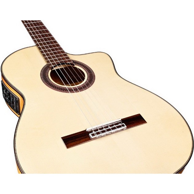 Дека инструмента сделана из массива ели с вырезом под руку, обечайка и нижняя дека сделаны из кипариса, бридж изготовлен из палисандра. Гриф сделан из махагони с накладкой из палисандра, размер верхнего порожка составляет 50 мм. Количество ладов грифа - 19. Мензура гитары составляет 650 мм (25 1/2"), цвет натуральный. Установлен комплект струн Savarez Cristal Corum High Tension 500CJ. Инструмент под правую руку.