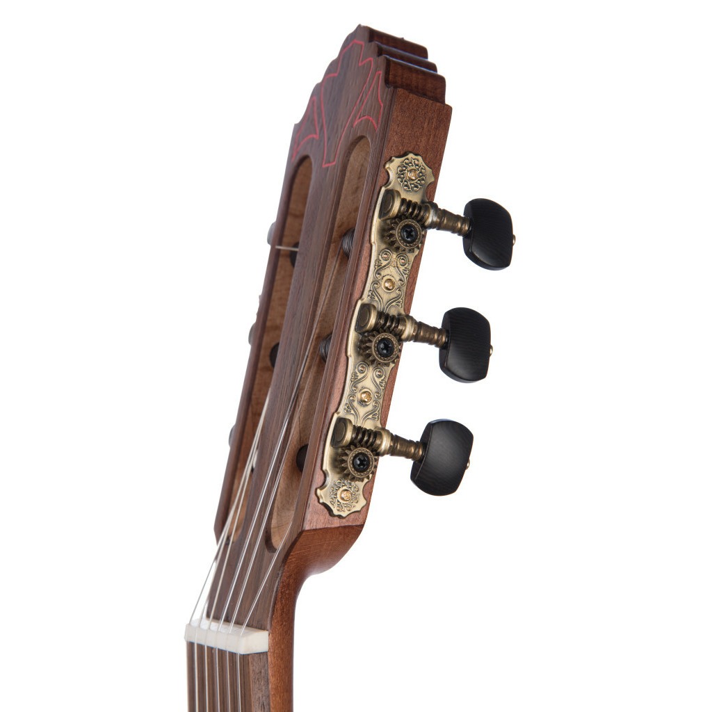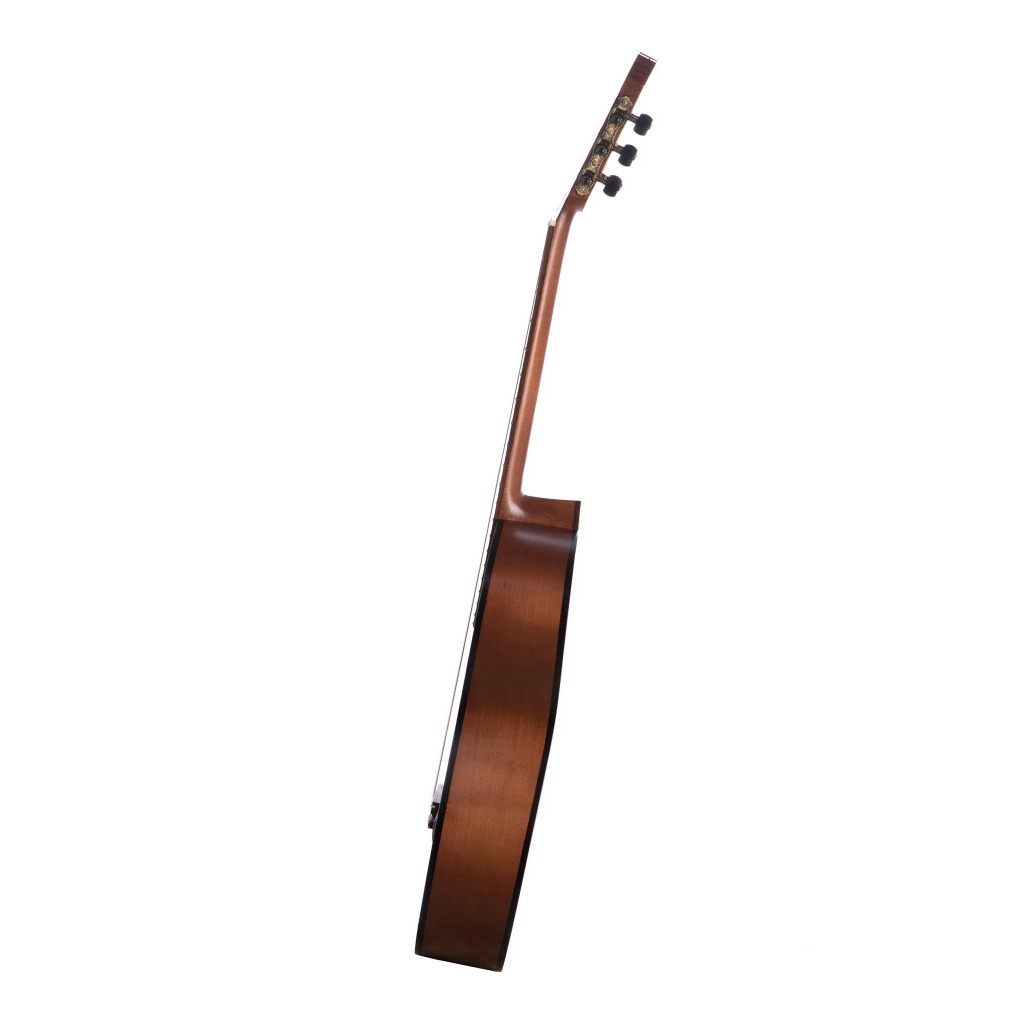 Ученическая классическая гитара, создавалась с привлечением преподавателей музыкальных школ. Более узкий гриф на 50мм по верхнему порожку (в то время как все классические гитары сделаны на 52мм), более энергоемкая форма, что дает дополнительное удобство для игры начинающему музыканту. Классические материалы такие как клен ( корпус) и кедр ( верхняя дека), дают превосходный звук инструменту, а более жесткая конструкция рамки гитары, позволит ей без ущерба пережить как излишнюю влажность, так и сухость воздуха.