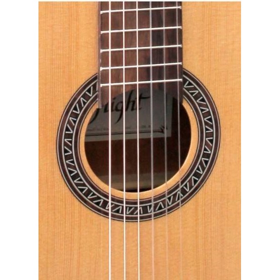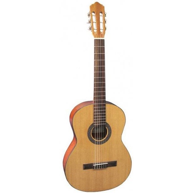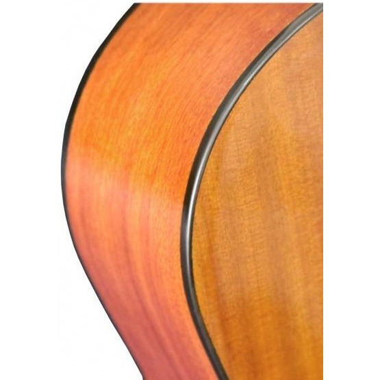 Верхняя дека изготовлена из ели, что обеспечивает чистое звучание, так необходимое для грамотного развития слуха. Нижняя дека и обечайки из сапеле, породы дерева по свойствам очень схожим с красным деревом, благодаря чему звук приобретает мягкость и глубину. Достаточно толстая, порядка 6 мм, палисандровая накладка на грифе создает в руке ощущение приятной весомости и надежности.
