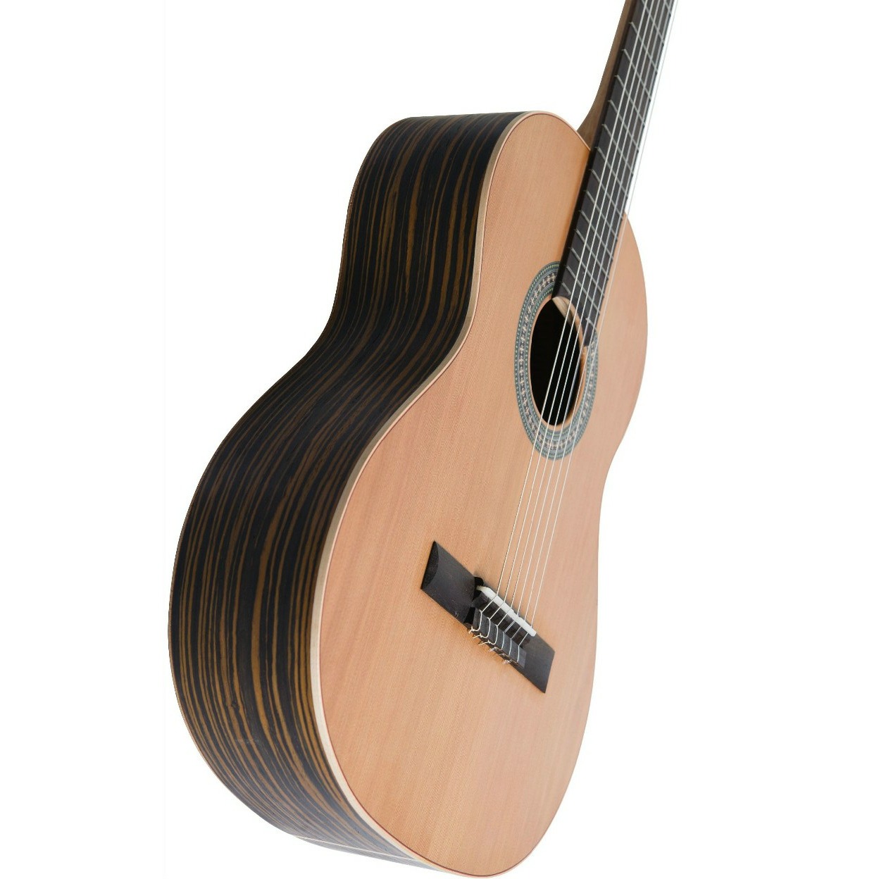 Классическая гитара C3 Ebony имеет в своем арсенале цельный кедровый топ и говорящее само за себя дерево Эбони во всем остальном корпусе. Применение такого твердого дерева в корпусе, пусть и в виде ламината, дает великолепное звучание и прекрасный цвет. На гитаре так же выполнена белая окантовка.