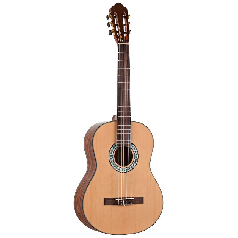 Замечательная гитара, одна из лучших в соотношении цена-качество. Верхняя дека выполнена из качественной ели, а нижняя - из дорогого и очень красивого дерева бокоте. Гриф из красного дерева с накладкой из палисандра.