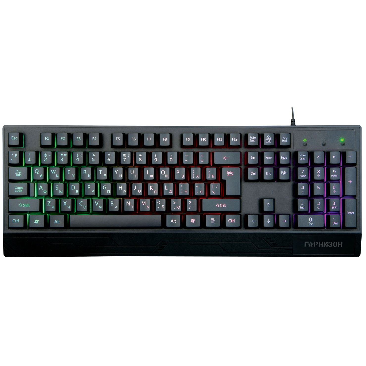 Гарнизон GK-210G - игровая клавиатура с радужной подсветкой. Модель оснащена классической раскладкой и механизированными клавишами, которые дают при нажатии тактильные ощущения механической клавиатуры. Конструкция клавиш при этом - мембранная. 19 клавиш с защитой от фантомных нажатий предотвращают случайный вылеты из игры. Клавиатура подключается к USB-порту компьютера и не требует установки драйверов.