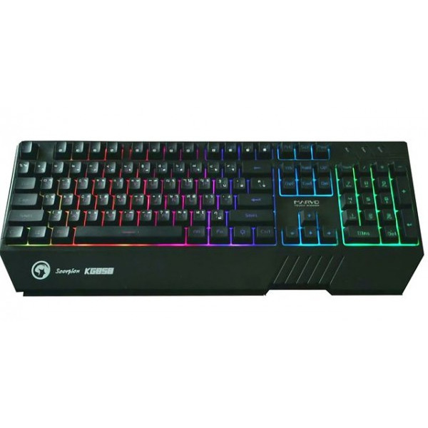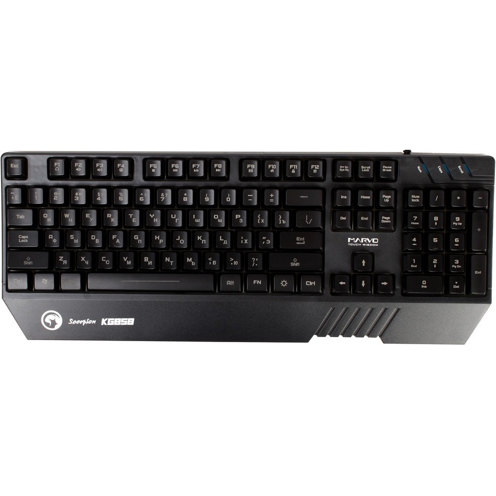 Игровая клавиатура Marvo Scorpion KG858 RGB с RGB подсветкой. 9 световых эффектов подсветки с регулировкой параметров. Софт для управления подсветкой не требуется. Клавиатура имеет один из самых надежных способов нанесения букв на клавиши – двойное литьё.