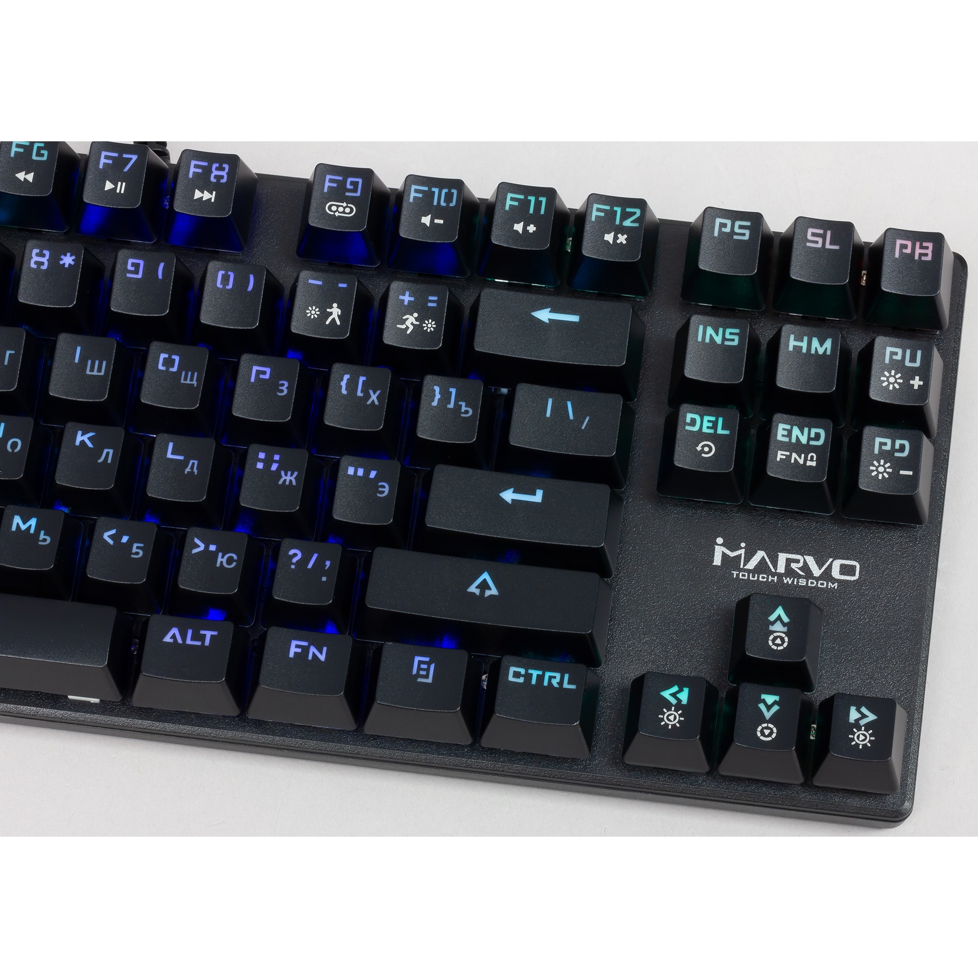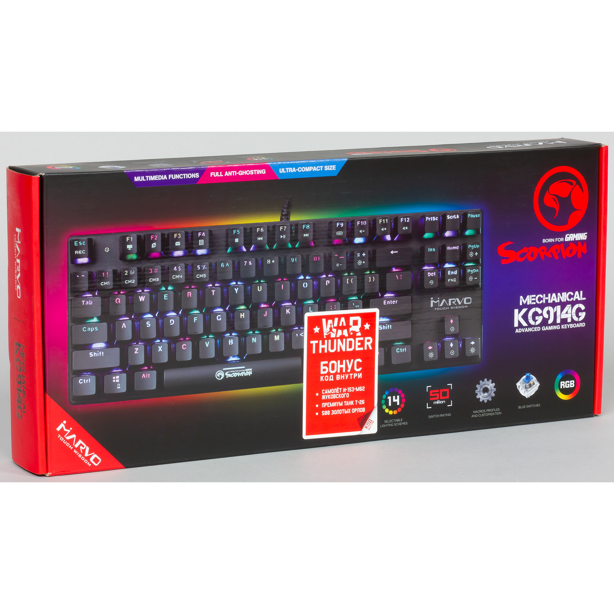 Синие механические переключатели Blue имеют четкий щелкающий клик, тактильную отдачу, срок службы в 50 млн нажатий и индивидуальную RGB подсветку. Компактная укороченная конструкция на 87 клавиш позволяет более удобно расположить рядом клавиатуру, коврик и игровую мышь. Безрамочная конструкция скелетон клавиатуры Marvo Scorpion KG914G позволяет легко поддерживать клавиатуру в чистоте и смотрится очень стильно.