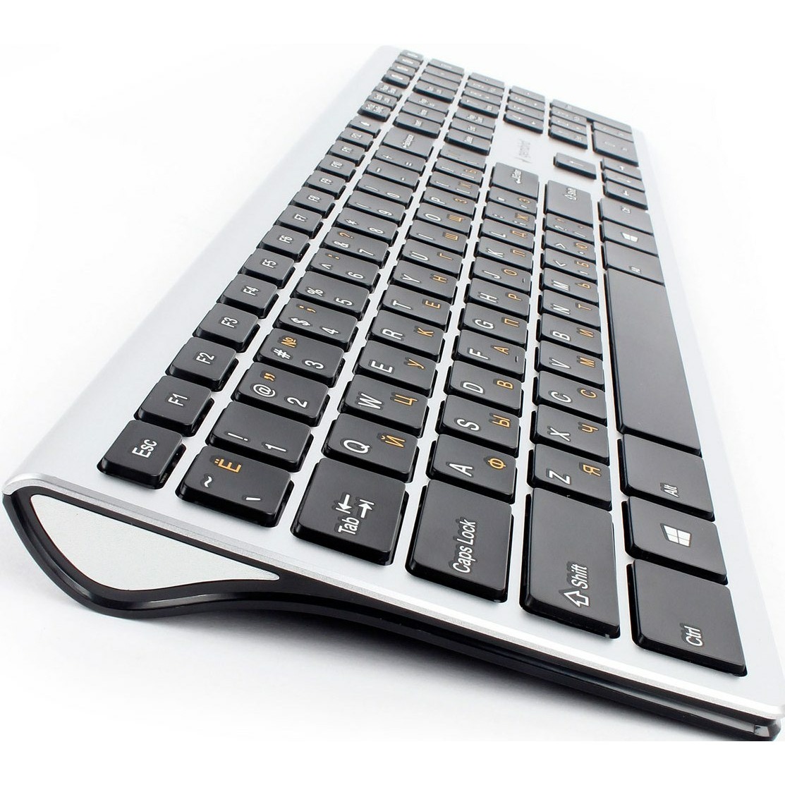 Gembird KBS-8100 — беспроводной (Bluetooth) комплект серебристо цвета, состоящий из полноразмерной ультратонкой клавиатуры и мыши со сменным разрешением