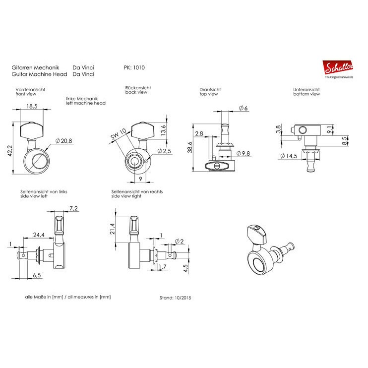 SCHALLER M6GOL A Da Vinci (АРТ.10100520) - колки для электрогитары (6 слева). "DA VINCI"-это новая серия гитарных колков от Schaller! Свежий и оригинальный аспект настройки! Элегантная форма! Изысканная отделка! Легендарное качество Schaller материалов и изготовления! Вы можете выбирать из 8-ми вариантов отделки: 24К золото, никель, рутений (серебристо-серый металл), хром, "матовый жемчуг", черный хром, матовый хром, "состаренная" медь (ручная полировка!)