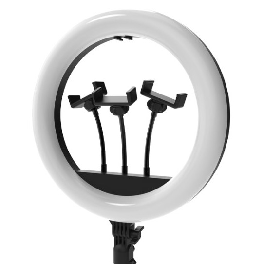 Кольцевая лампа диаметром 36 см, имеет 9 уровней яркости и 3 цветовых температуры: теплый, нейтральный и холодный свет. Предназначена для установки на штатив (в комплект не входит) . Питание от USB-порта.