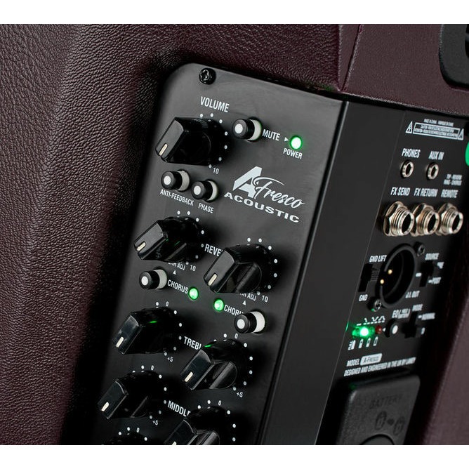 LANEY A-FRESCO - активная 1-но полосная акустическая система с 2х канальным микшером, мощность 30 Вт, динамик 1х8", 2 комб. входа 1/4" JACK/XLR, кнопка Anti-Feedback, эквалайзер, эффекты, петля эффектов, выход на наушники, питание от блока питания или от батарей. LANEY A-FRESCO - сверхкомпактная акустическая система, разработанная для использования как с питанием от сети, так и с батареей, с широким диапазоном акустических элементов управления и функций, включая цифровую реверберацию и хорус.