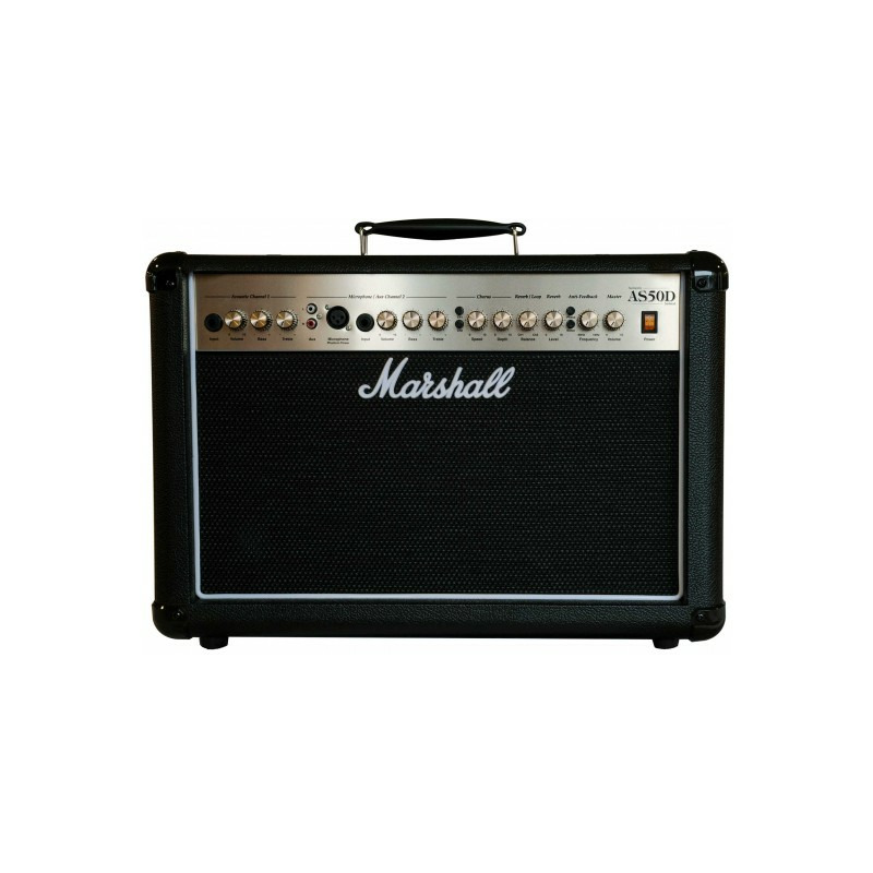MARSHALL AS50DB LIMITED 50W 2X8" ACOUSTIC COMBO – двухканальный комбоусилитель от знаменитого британского производителя, специально разработанный для акустических гитар. Это модель лимитированной серии, которая не только выдаёт великолепный звук, она также имеет впечатляющий стильный дизайн и оснащена рядом современных функций, делающих усилитель в полной мере универсальной моделью. Мощности 50 Ватт вполне достаточно для выступлений в помещениях небольшого и среднего размера. Комбоусилитель оснащён двумя высококачественными 8-дюймовыми динамиками и одним полимерным купольным высокочастотным излучателем. Наличие двух каналов позволяет подключить к усилителю гитару и вокальный микрофон. MARSHALL AS50DB оснащён высококачественным микрофонным предусилителем. Для настройки звучания имеется двухканальный эквалайзер, а для создания глубокого, насыщенного звука можно использовать встроенные эффекты (реверберация, хорус). Возможности коммутации предусматривают подключение внешних процессоров эффектов, микшера или рекордера, а также опционального футсвитча. Комбоусилитель заключен в компактный прочный корпус с удобной ручкой для переноски сверху, снизу имеются устойчивые ножки.