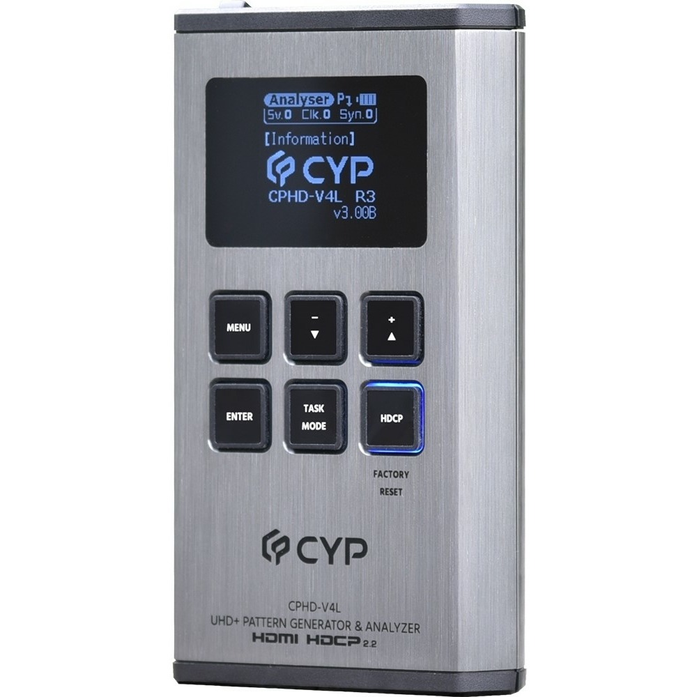 CPHD-V4L – портативный генератор и анализатор сигналов HDMI разрешением до 4096x2160/60 (4:4:4, 8 бит) c поддержкой HDCP 1.4/2.2 и HDR. Расширенная поддержка EDID с 10-ю стандартными и 10-ю пользовательскими наборами данных, мониторинг служебного канала SCDC. Устройство позволяет выбирать 23 разрешения выходного сигнала, имеется 11 встроенных тестовых изображений, в наличии функция тестирования кабелей. Полоса пропускания 600 МГц. Вход/выход HDMI с поддержкой LPCM 2.0, 5.1 и 7.1. Питание от аккумулятора 18650 (в комплект не входит) или по USB. Может работать с опциональным ПО для ОС Windows.