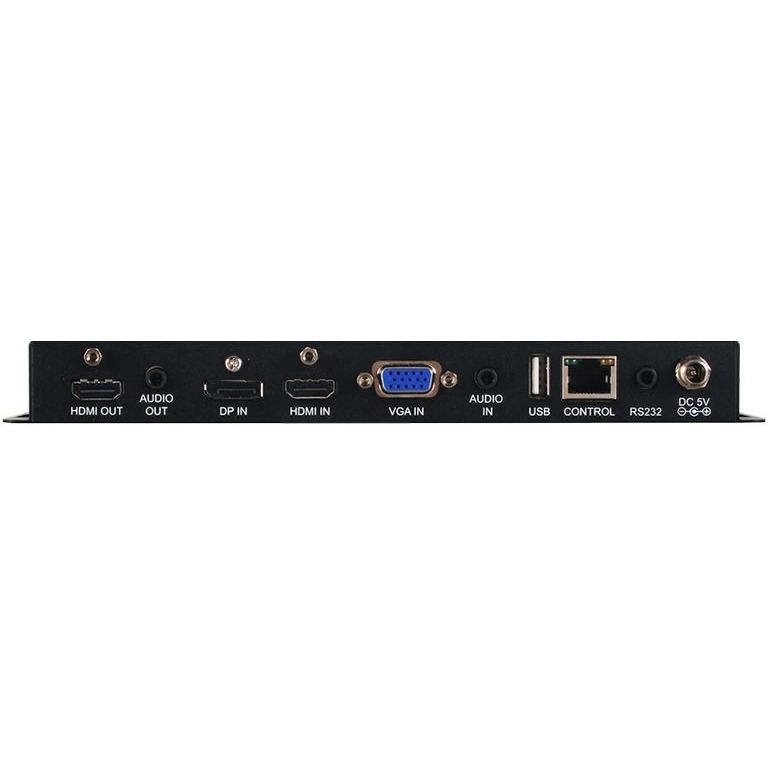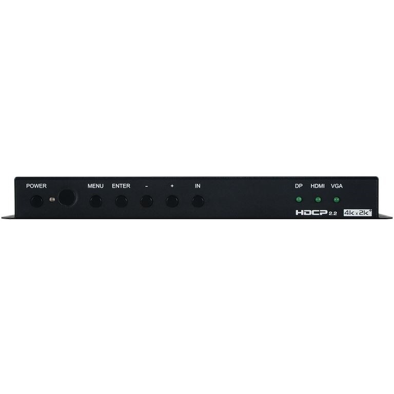 CSC-6010D – масштабатор/автоматический коммутатор сигналов DP, HDMI 2.0 разрешением до 4096x2160/60, 3D (при цветовом пространстве YUV 4:4:4) c HDCP 1.4, 2.2 и управляемым EDID, сигналов VGA разрешением до 1680x1050/60 с аналоговым аудио (miniJack 3,5 мм) в сигналы HDMI с аналоговым выходом стереоаудио (miniJack 3,5 мм). Автопереключение осуществляется на последний подключенный сигнал. Управление устройством осуществляется по ИК, RS-232 и IP, имеется web-интерфейс.